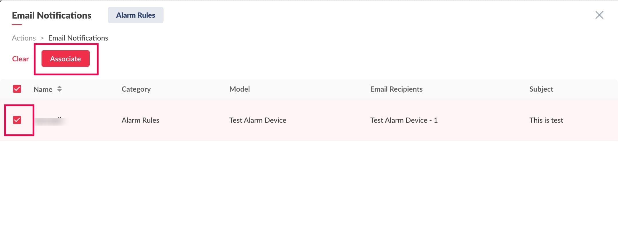 1. Follow the steps provided in the Creating Alarm Rule Templates or Alarm Rules to create an alarm rule template or alarm rule, respectively. Else, edit an existing alarm rule.2. Traverse to the Configure Actions section.3. Click Add Actions against Configure Actions.4. Select Email Notification, Webhook, or Custom Function from the drop down list.Push Notification action is currently not available for Alarm Rules5. Select the checkbox against the action you want to associate, then click Associate.