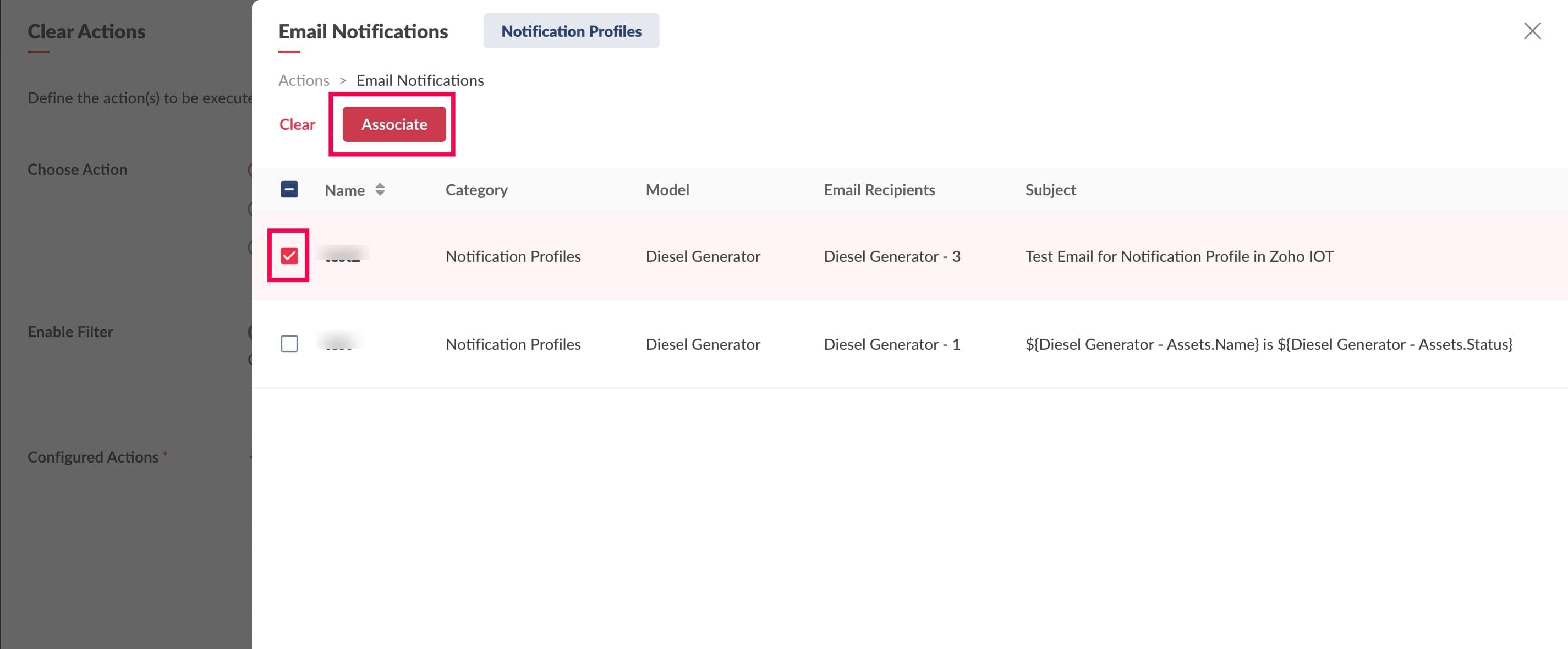 1. Follow the steps provided in the Configuring Notification Profiles to create a notification profile.2. Traverse to the Configure Actions section.3. Click Add Actions or Edit Actions against Configure Actions.4. Select Email Notification, Webhook, Custom Functions, or Push Notifications from the drop-down list.5. Select the checkbox against the action you want to associate, then click Associate.