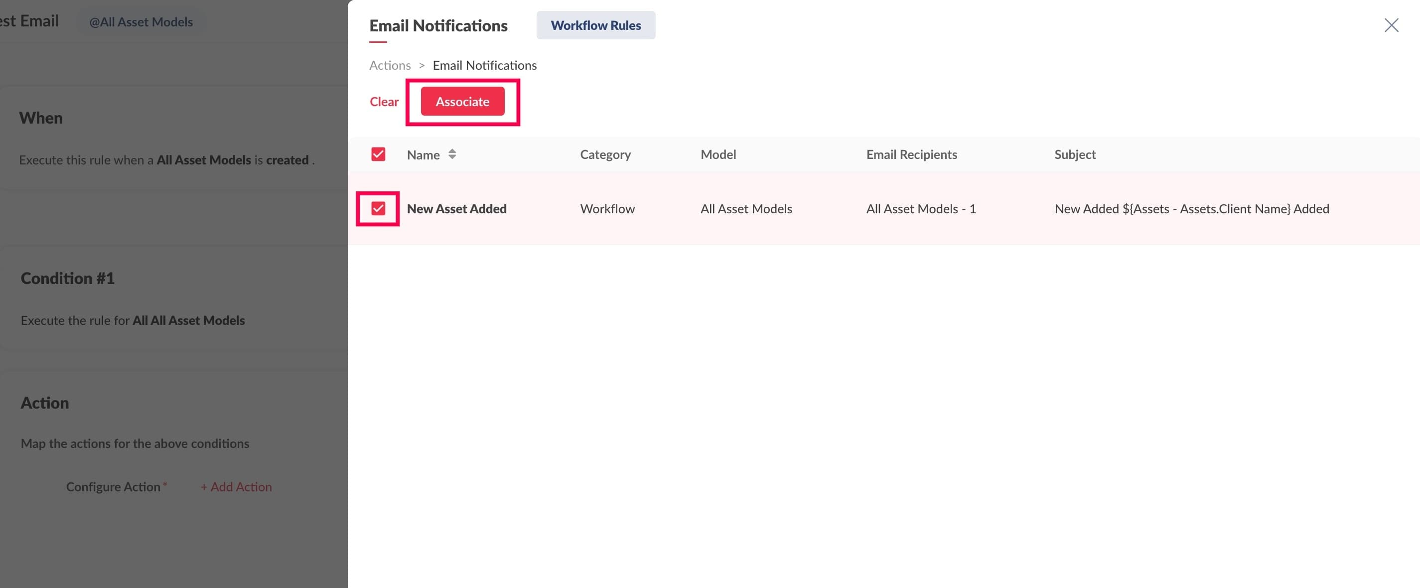 1. Follow the steps provided in the Configuring Workflow Rules to create a workflow rule.2. Traverse to the Actions section.3. Click Add Actions or Edit Actions against Configure Actions.4. Select Email Notification, Webhook, Custom Functions, or Push Notifications from the drop-down list.5. Select the checkbox against the action you want to associate, then click Associate.