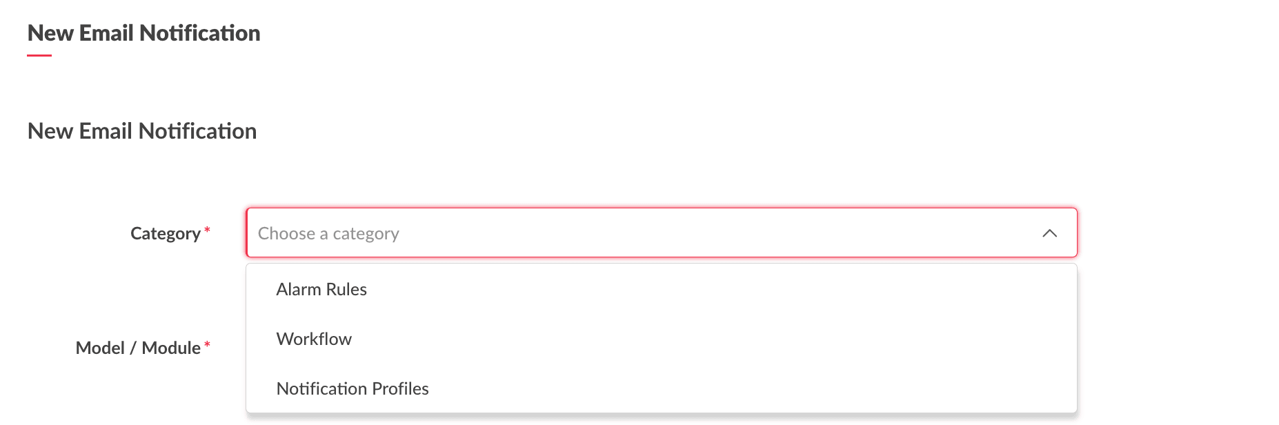 4. Click New Email Notification to display the mail notification configuration form.5. Select the category. This is the feature from which the email action will be triggered.