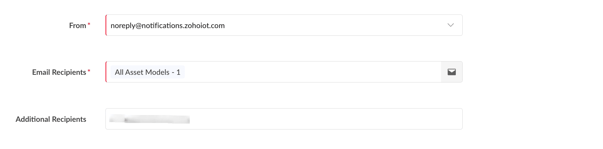 7. Configure the from, to, and cc email addresses in the From, Email Recipient, and Additional Recipient text boxes.