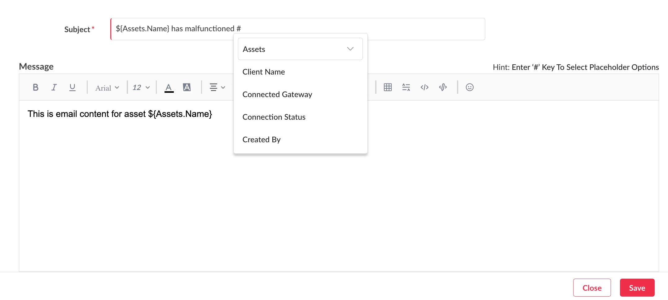 Note: Use the # key inside the subject or message boxes to insert managed entity property values.9. Click Save.