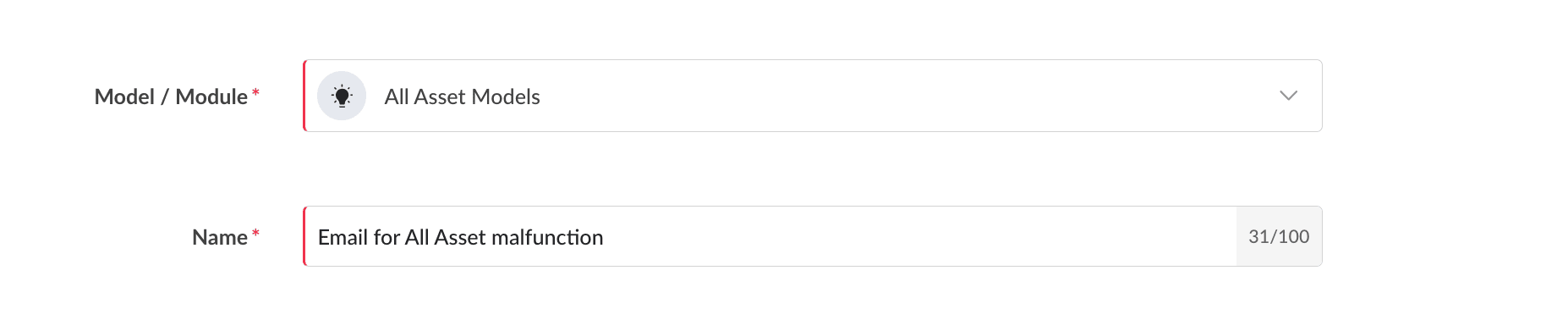 6. Select the model/module and provide a name for the email configuration.