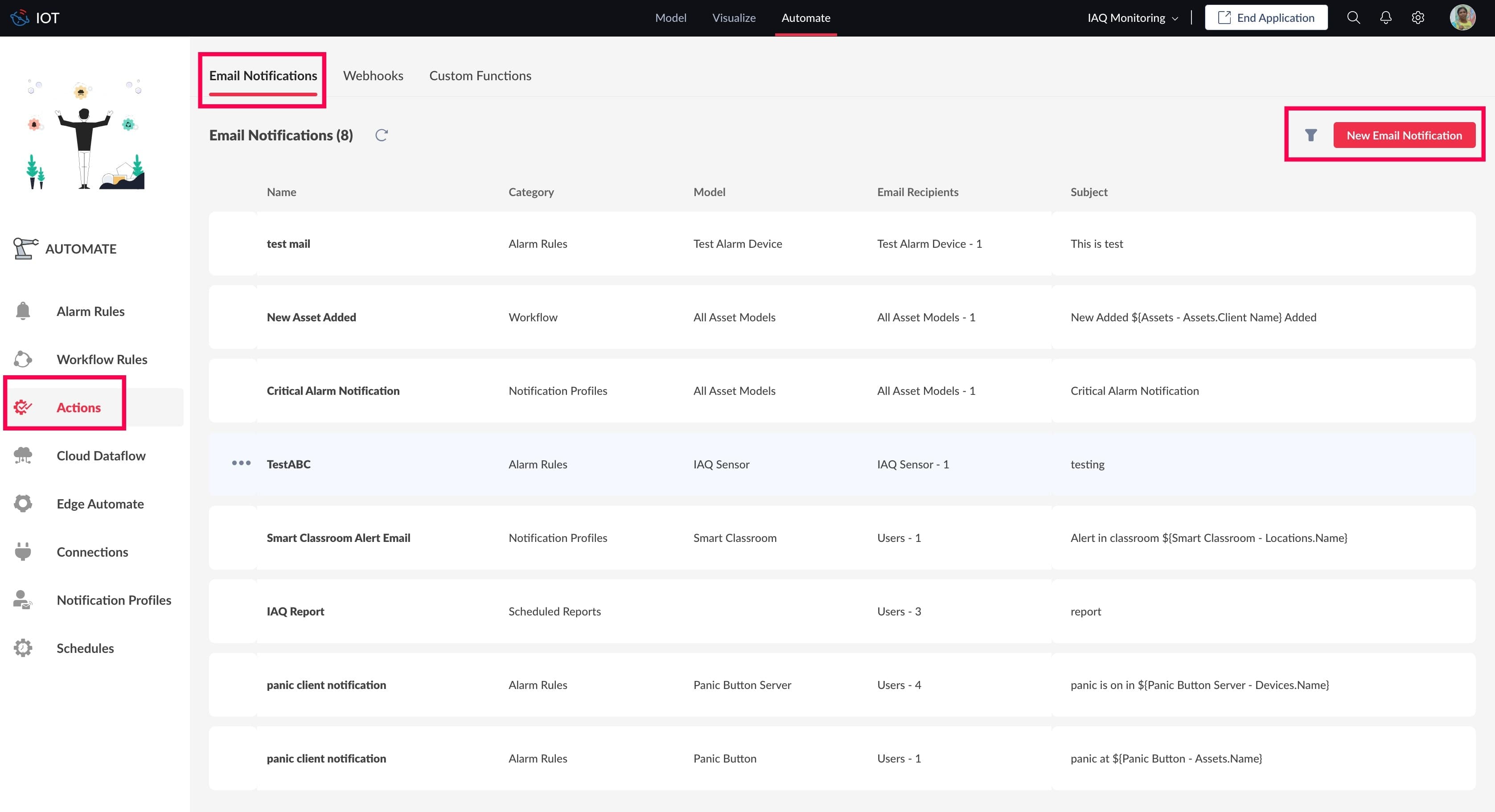 1. Access the Developer Application.2. Select the Automate tab, then select Actions in the left pane.3. Ensure the Email Notification tab is selected at the top of the list view. The available configurations are displayed.