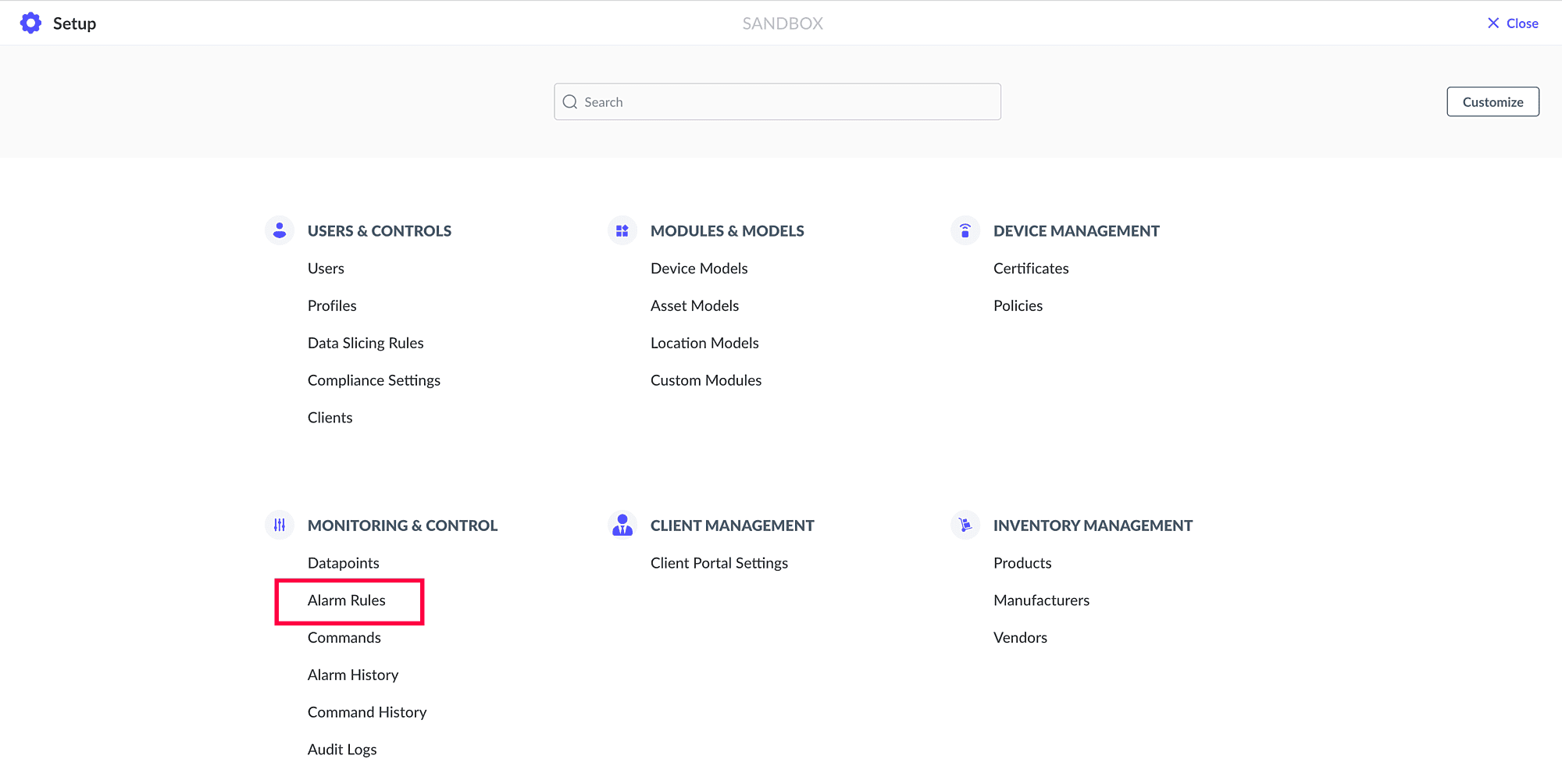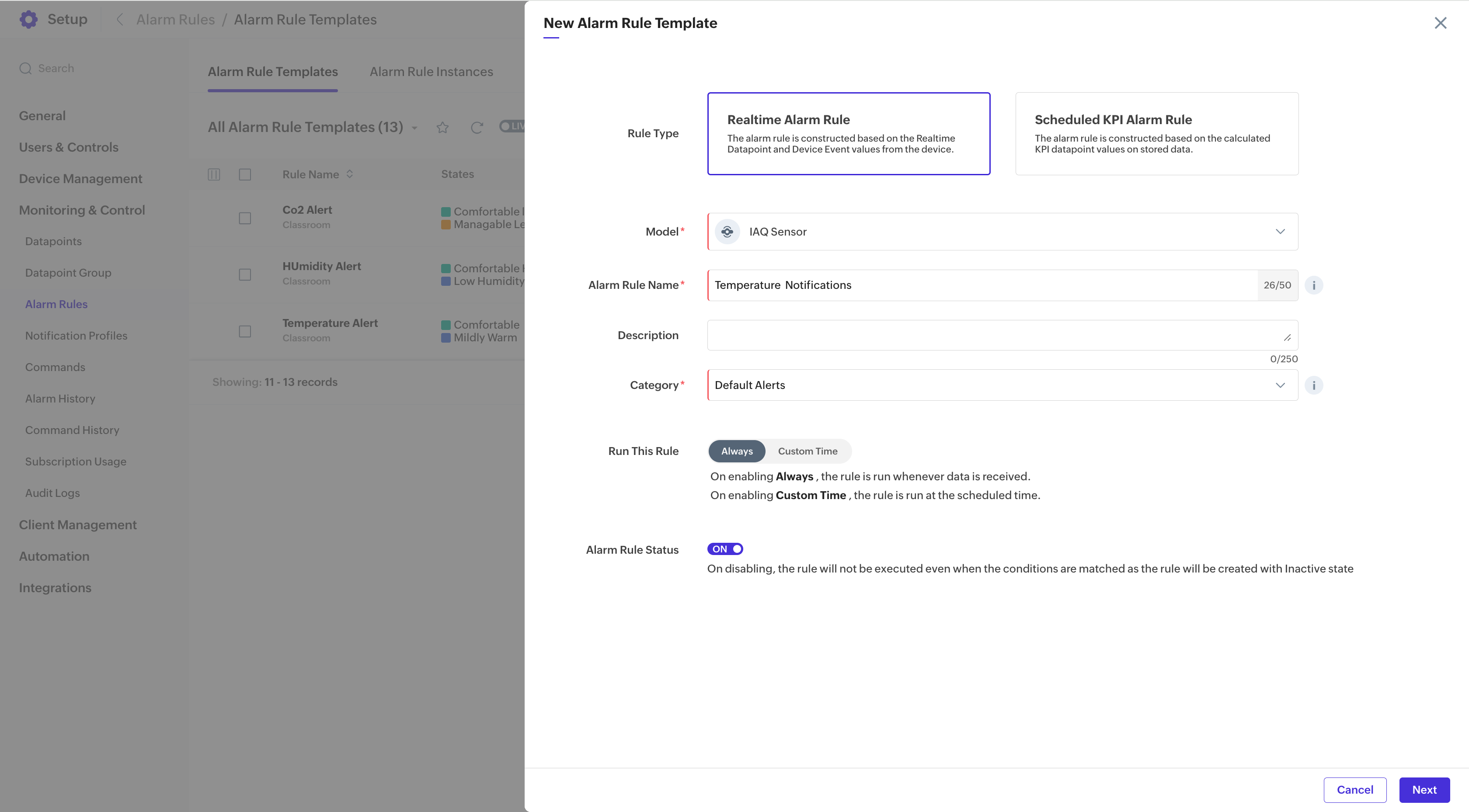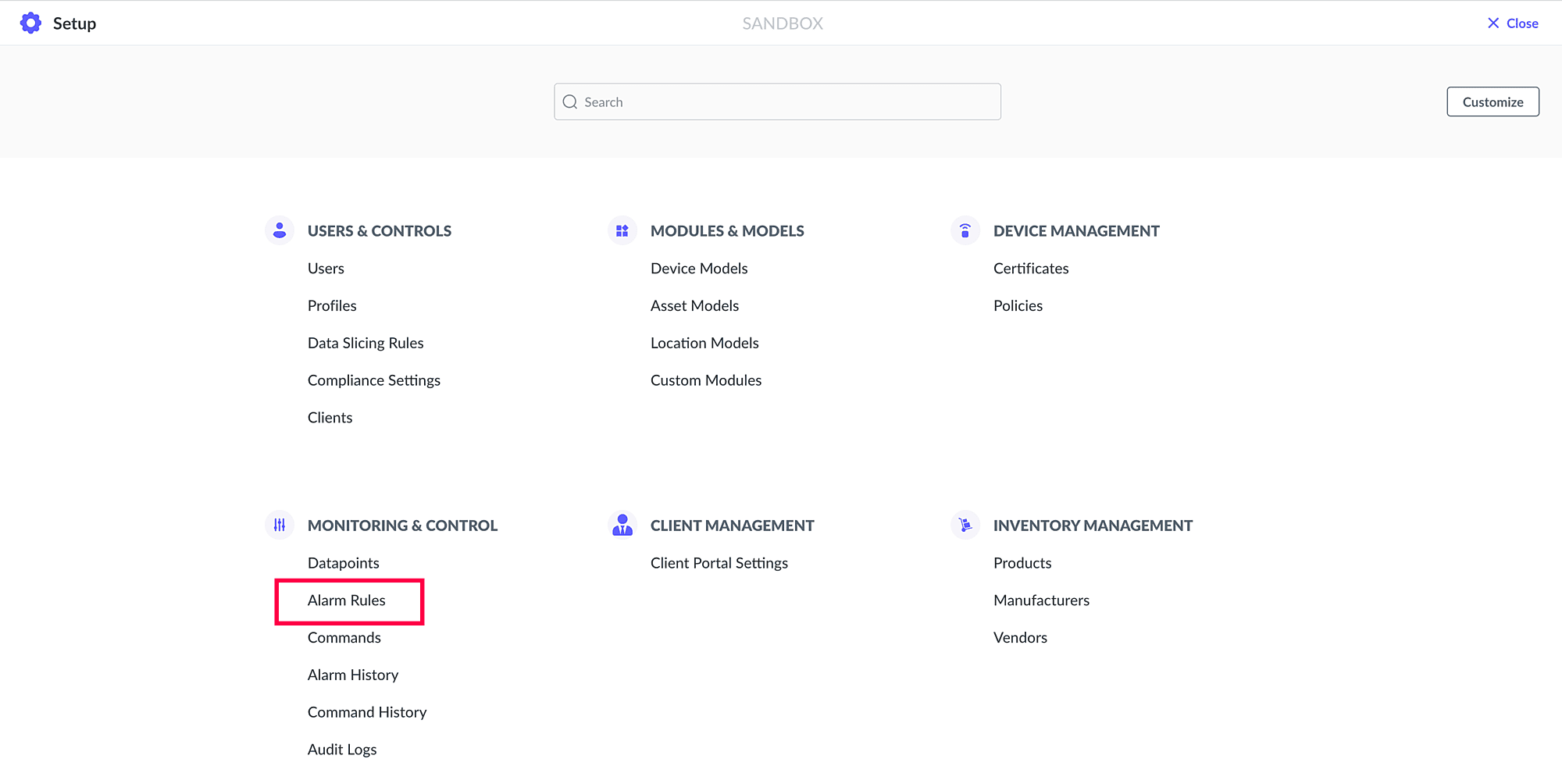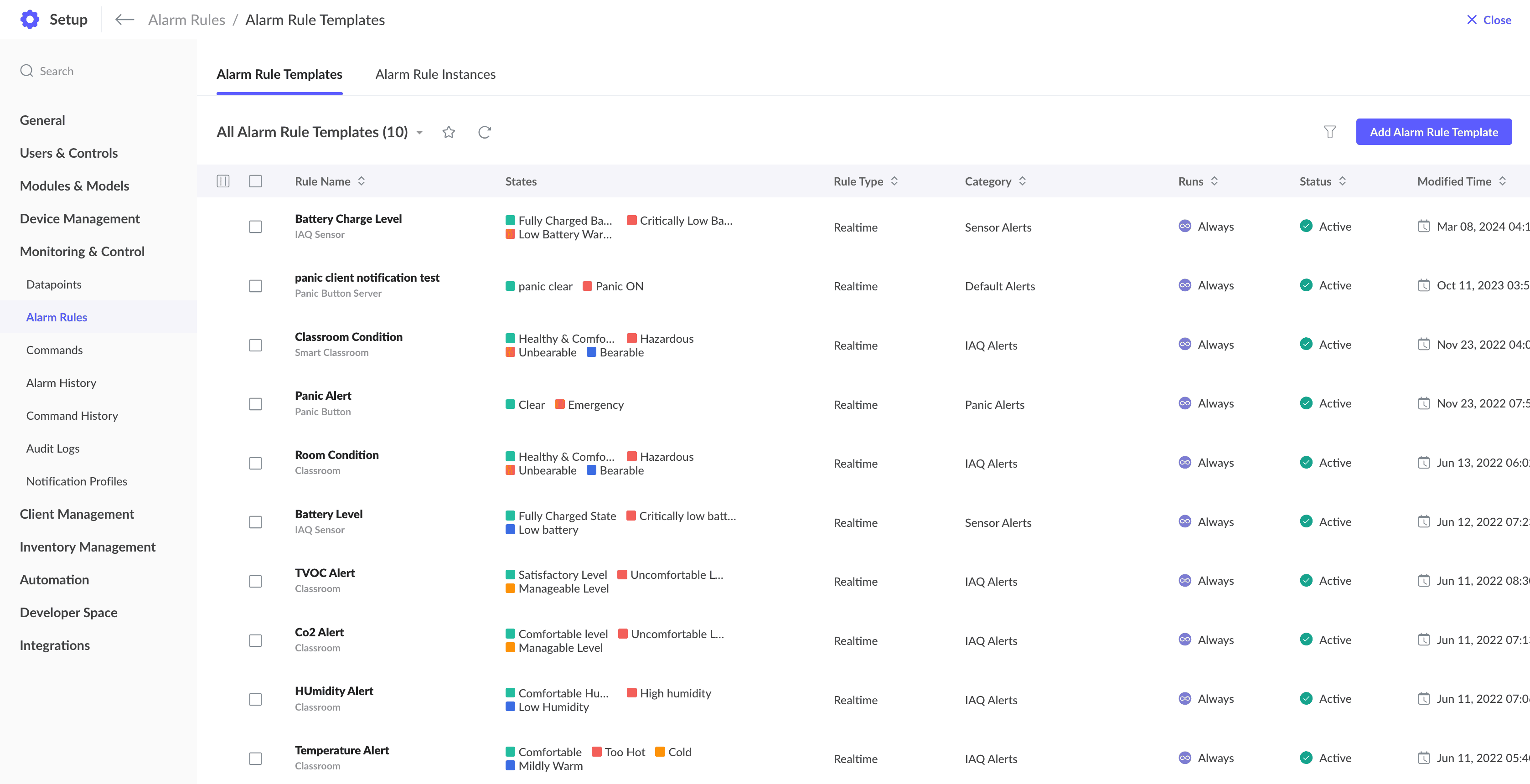 Alarm Rule Templates can be configured for Device, Asset, or Location models from the respective Summary page from the developer application.