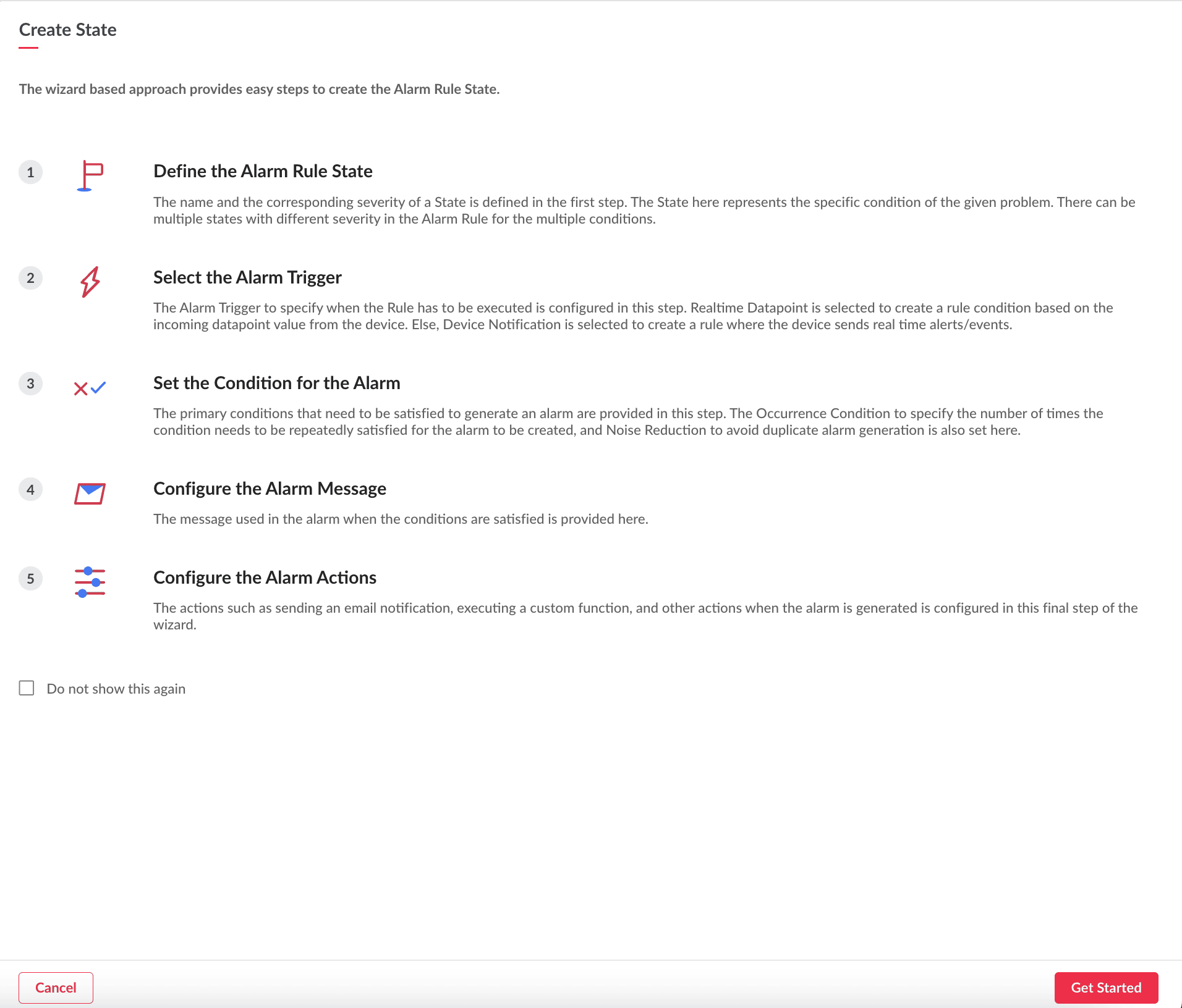 The following screen is displayed when adding the State for the first time. Click "Do not show this screen again" if you do not want to view this screen on consequent Alarm State addition.
