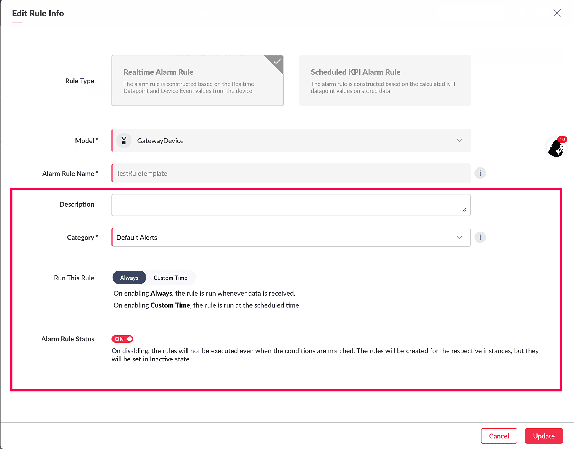 The name, description, category, etc., are the basic information of an Alarm Rule. You can modify the Description, Category, Run This Rule, and Status options anytime in the application.