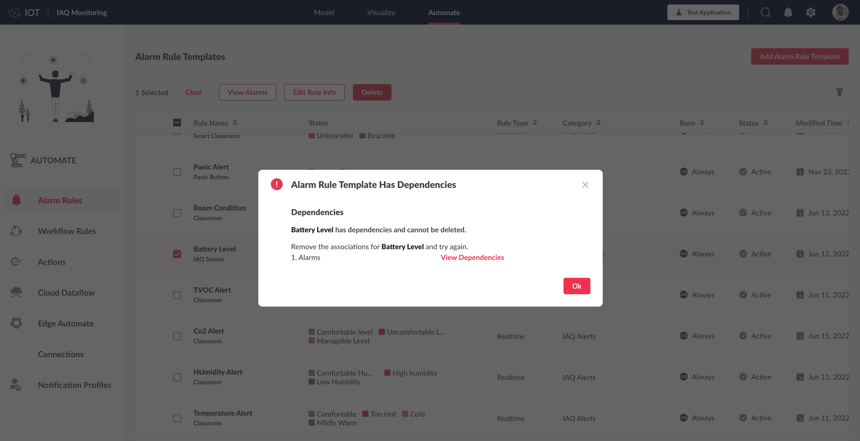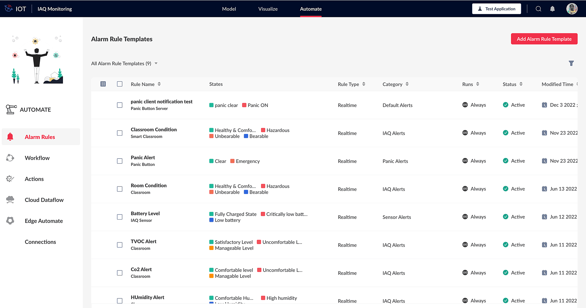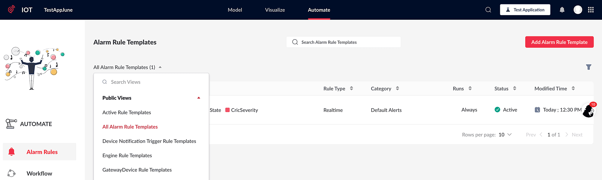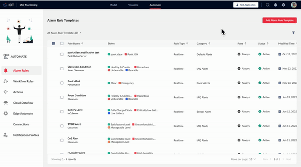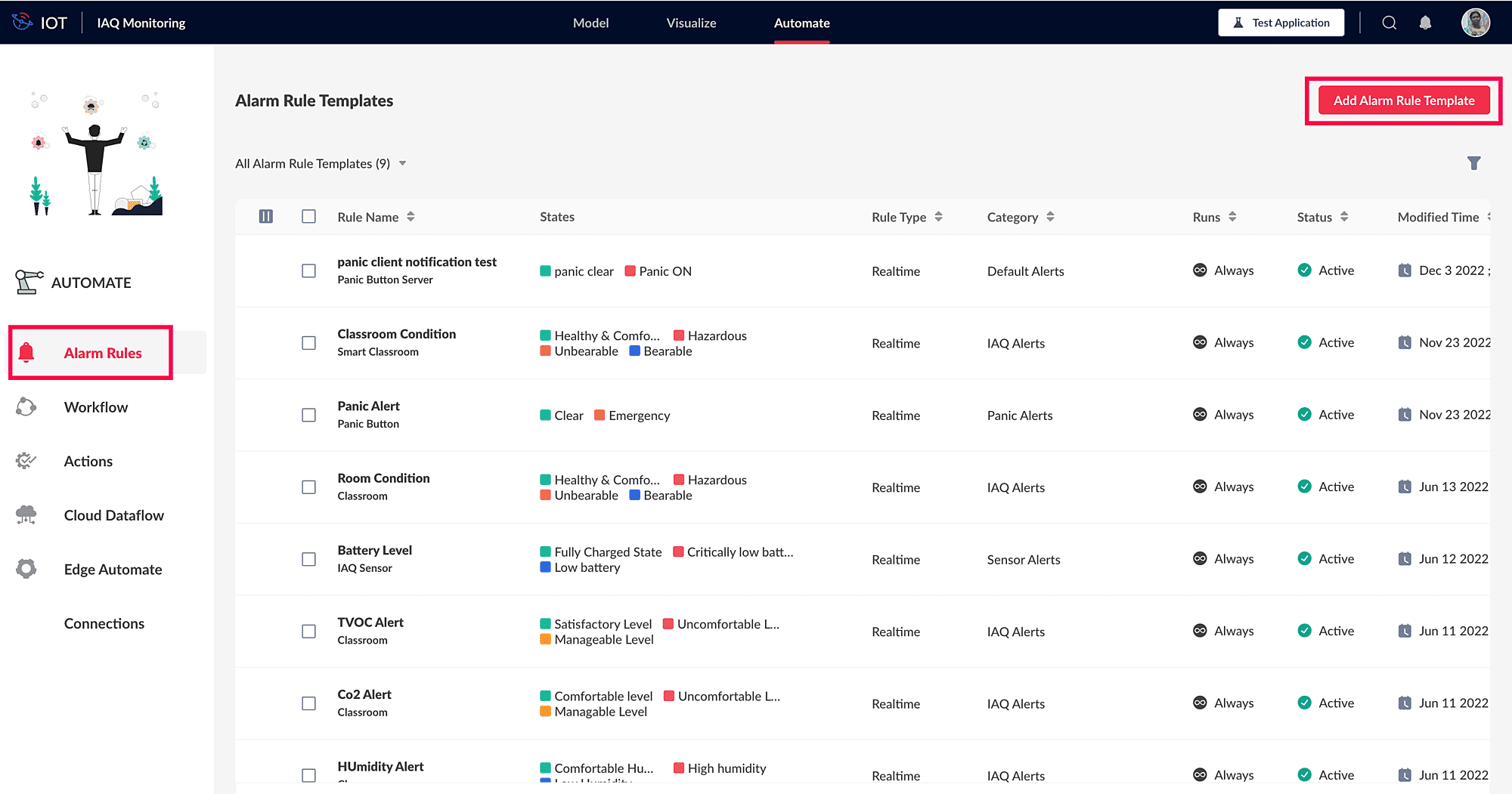 1. Select the Automate tab on the top of the Developer Application portal screen. The Alarm Rules option is selected on the left by default, and all the Alarm Rule Templates already configured are displayed in a list view on the page.