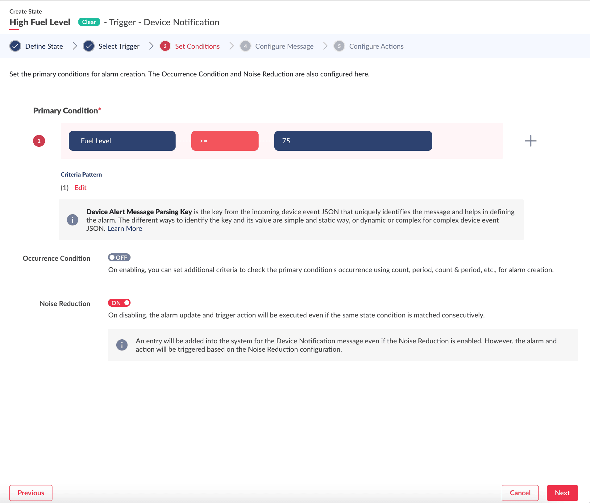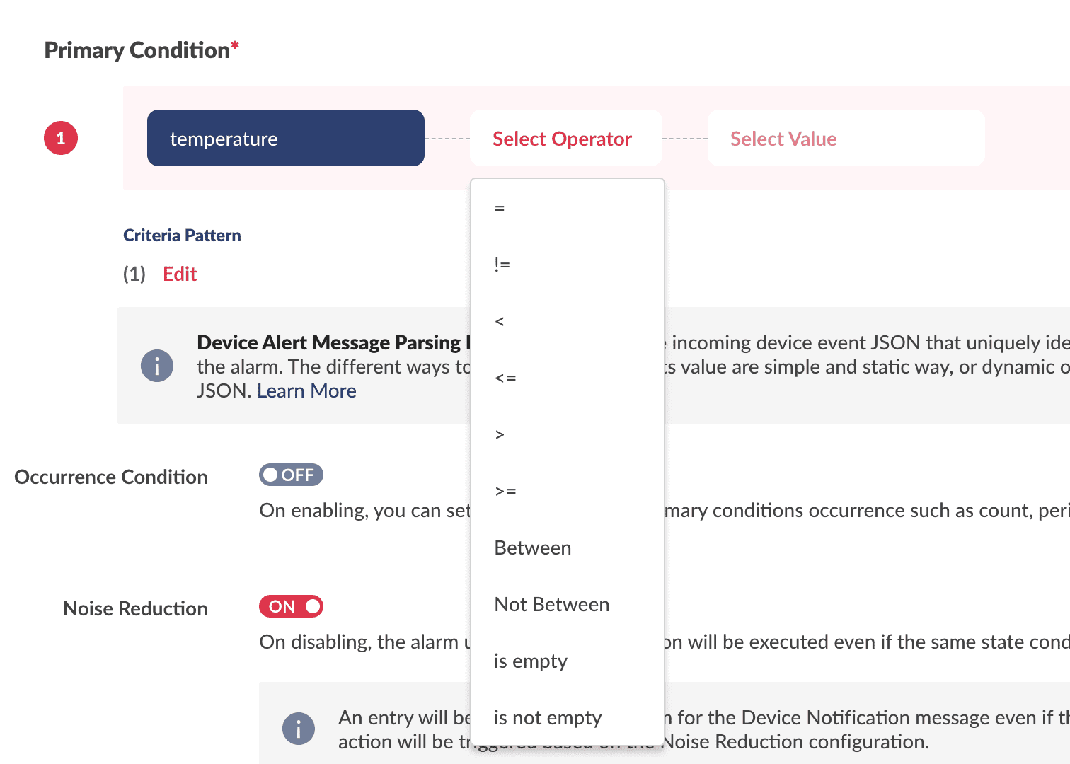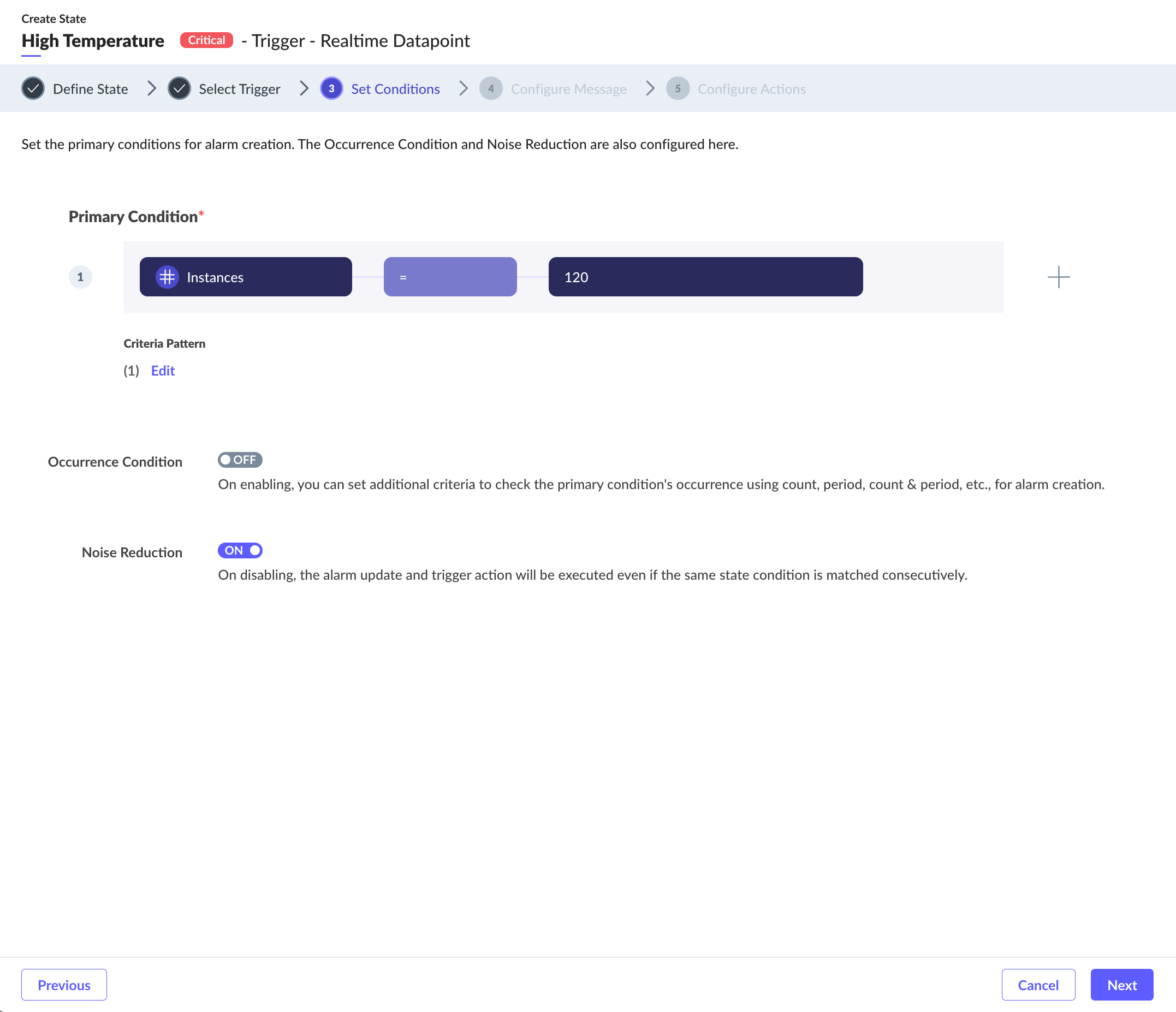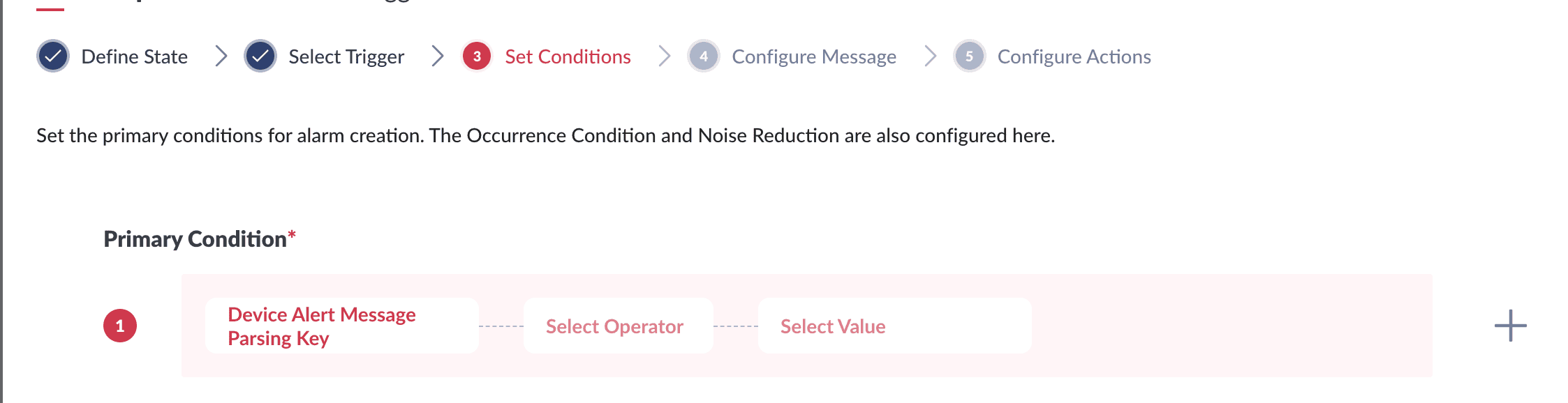 The alarm conditions, such as the primary condition for the alarm, occurrence condition, and noise reduction criteria, are configured in this step.