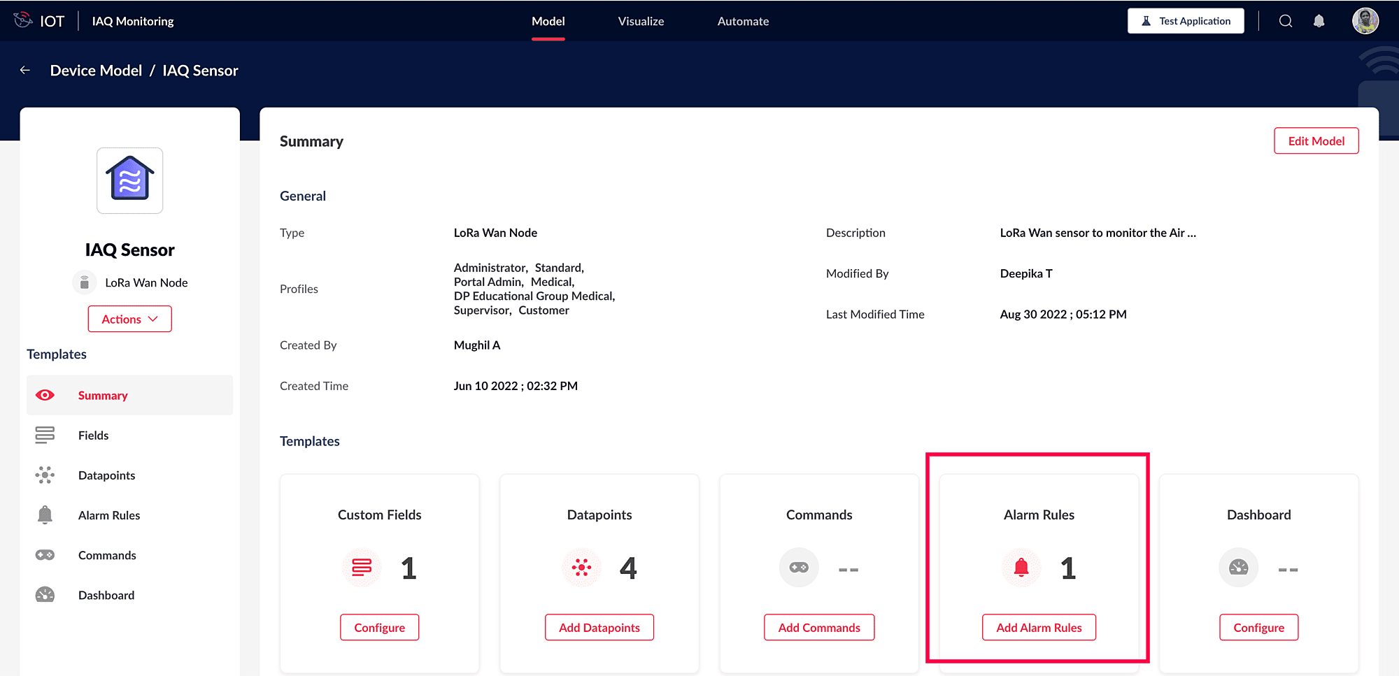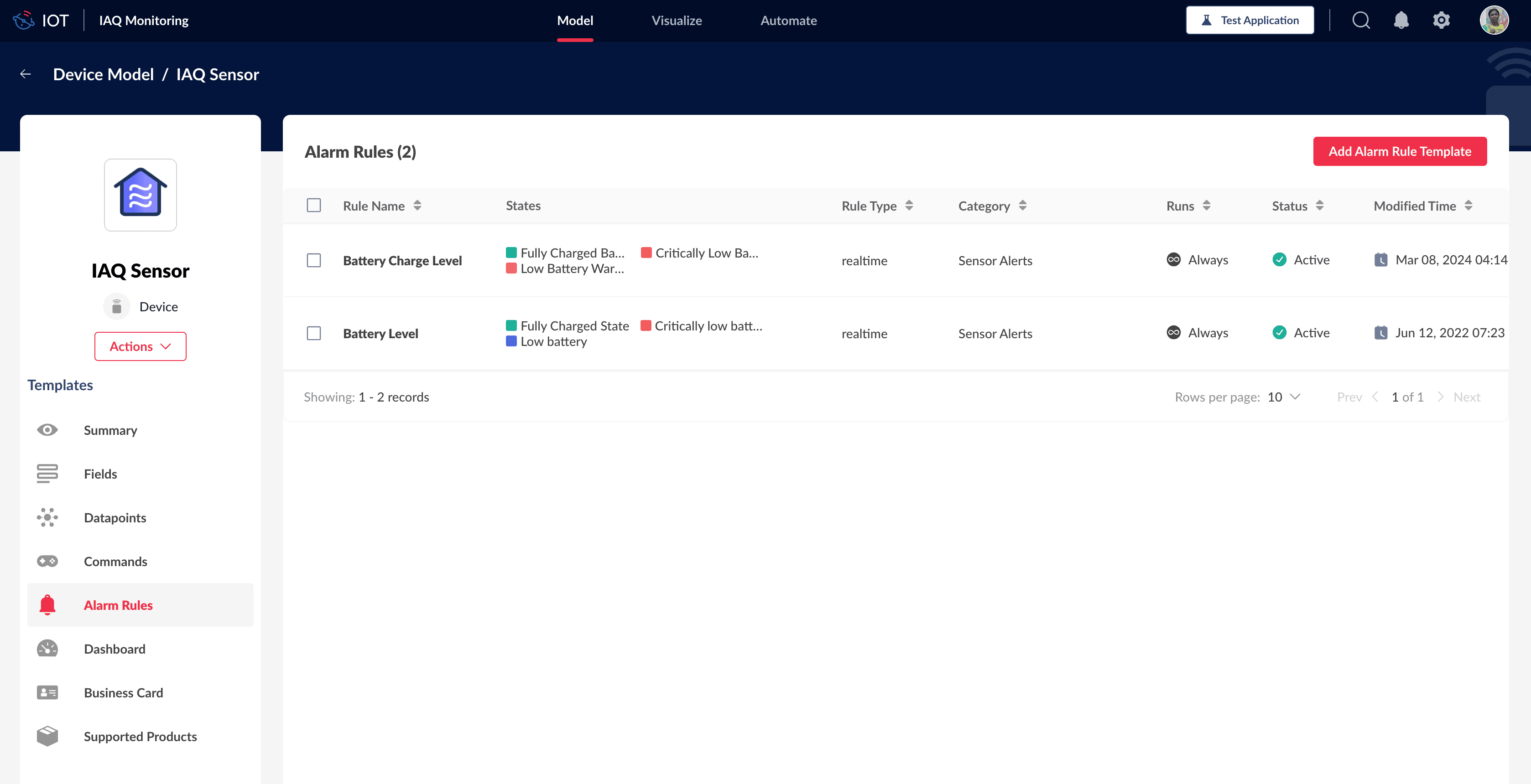 Alarm Rule Template for a particular model can be viewed from the Model Detail's page.