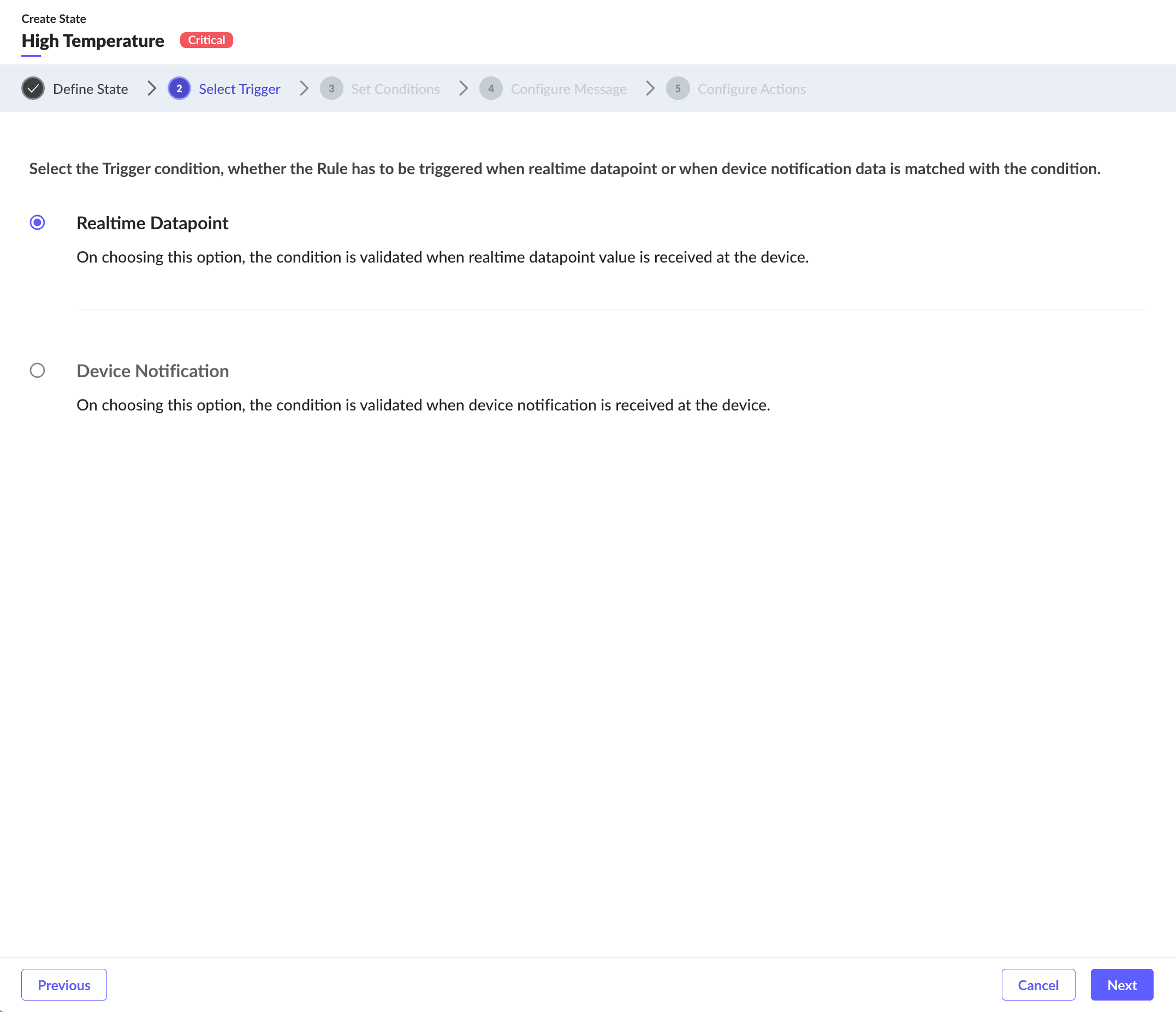- Select Realtime Datapoint if you want to create a rule condition based on the incoming datapoint value from the device.