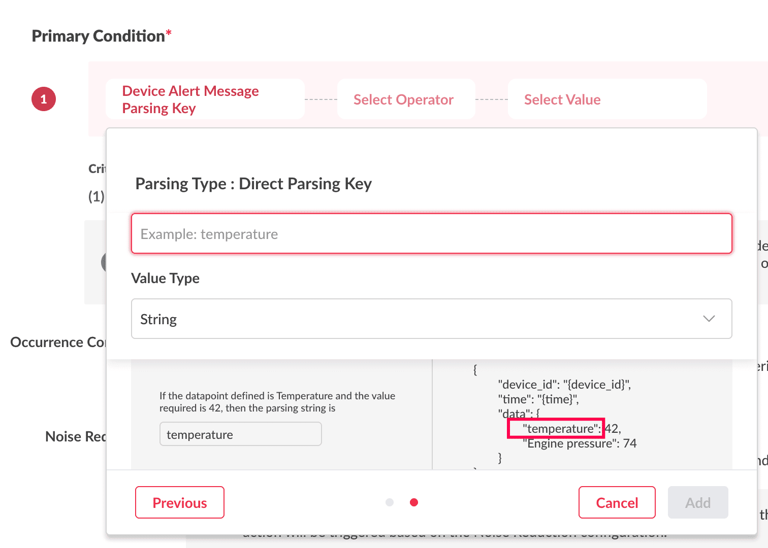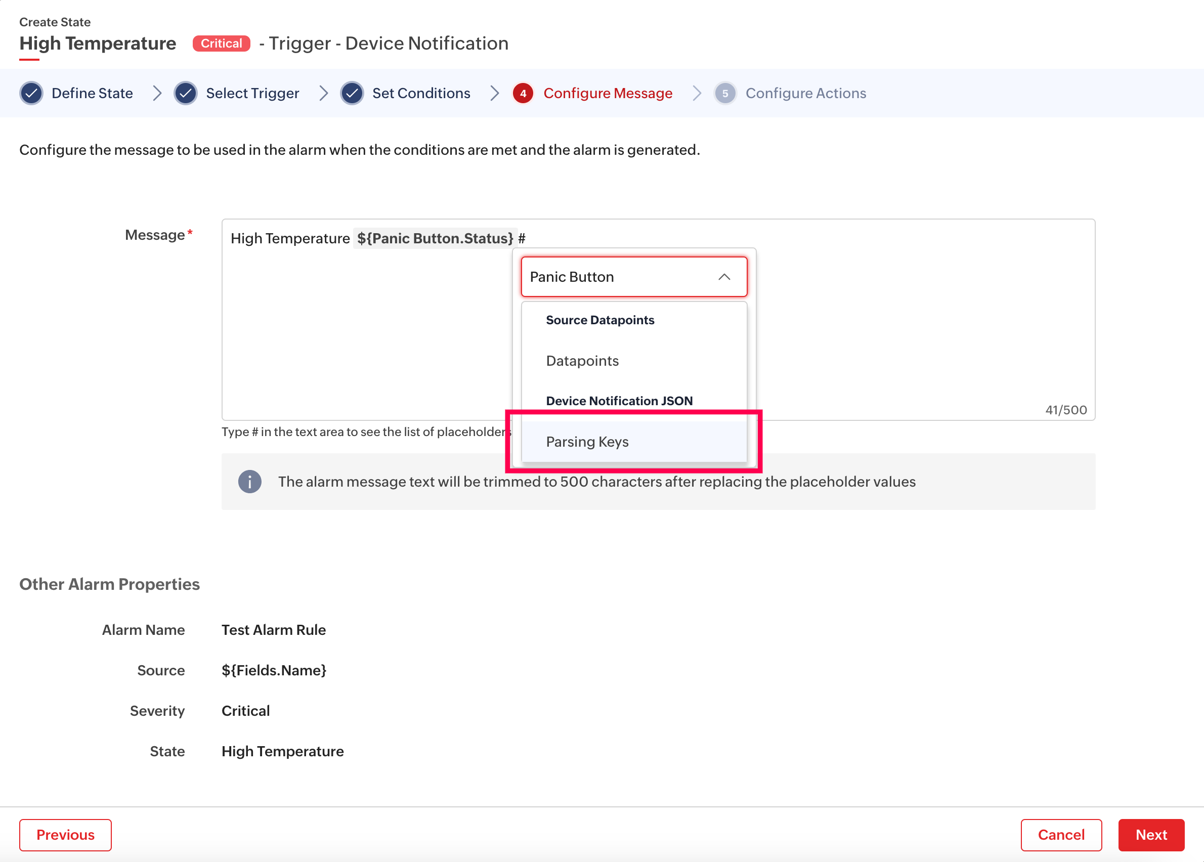 Note: Device Alert Message Parsing Key is the key from the incoming device event JSON that uniquely identifies the message and helps in defining the alarm. The different ways to identify the key and its value are simple and static way, or dynamic or complex for the complex device event JSON.