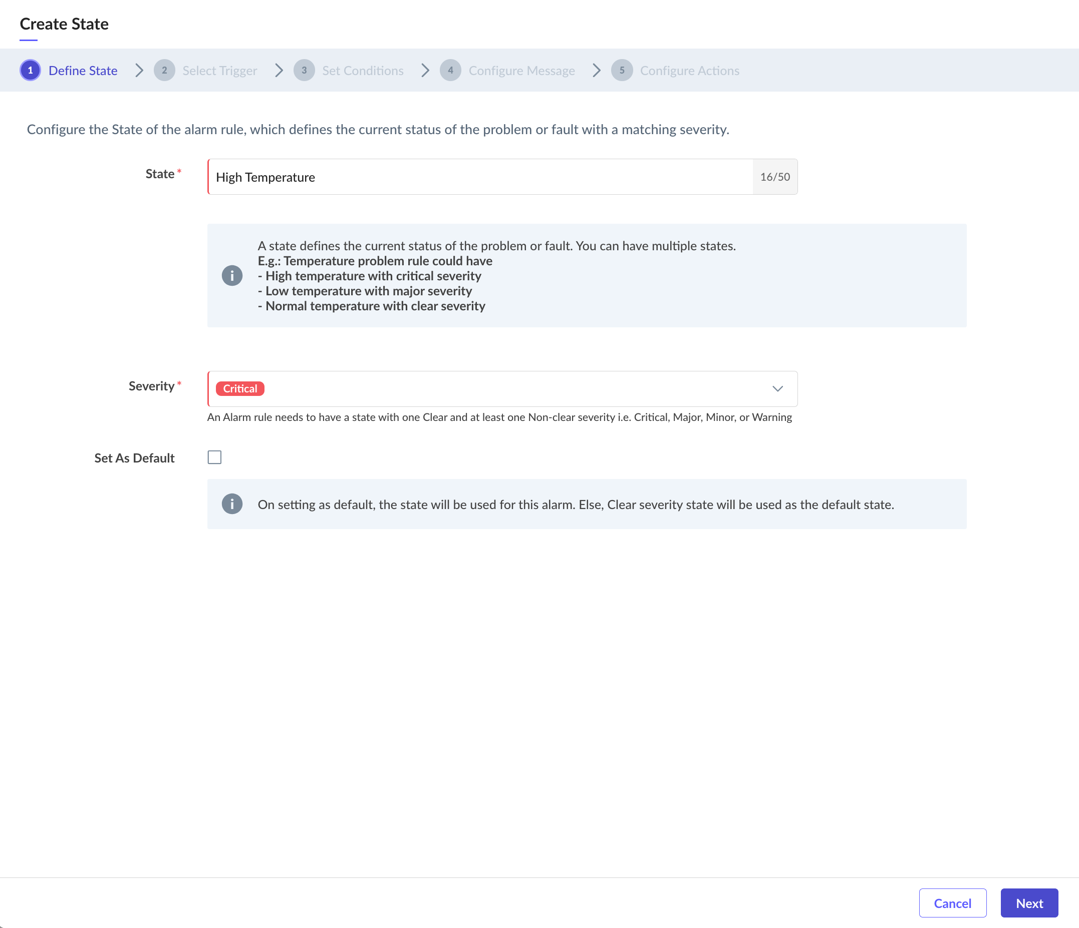 Any problem can have different conditions also referred to as severity to identify the specific context of the problem. These conditions are represented using Alarm States. Defining the States of an Alarm is the first step in adding an Alarm State. Let's proceed to define the Alarm State.