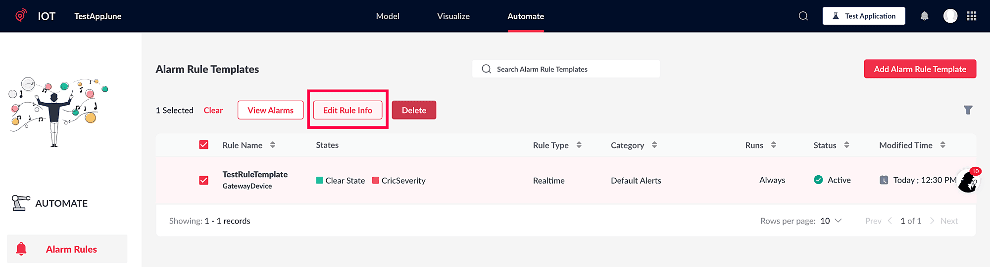 Sections of the Alarm Rules Templates, State Info, Trigger, Condition, and Action details can be modified from the Alarms Rules view page in the Developer Application portal.