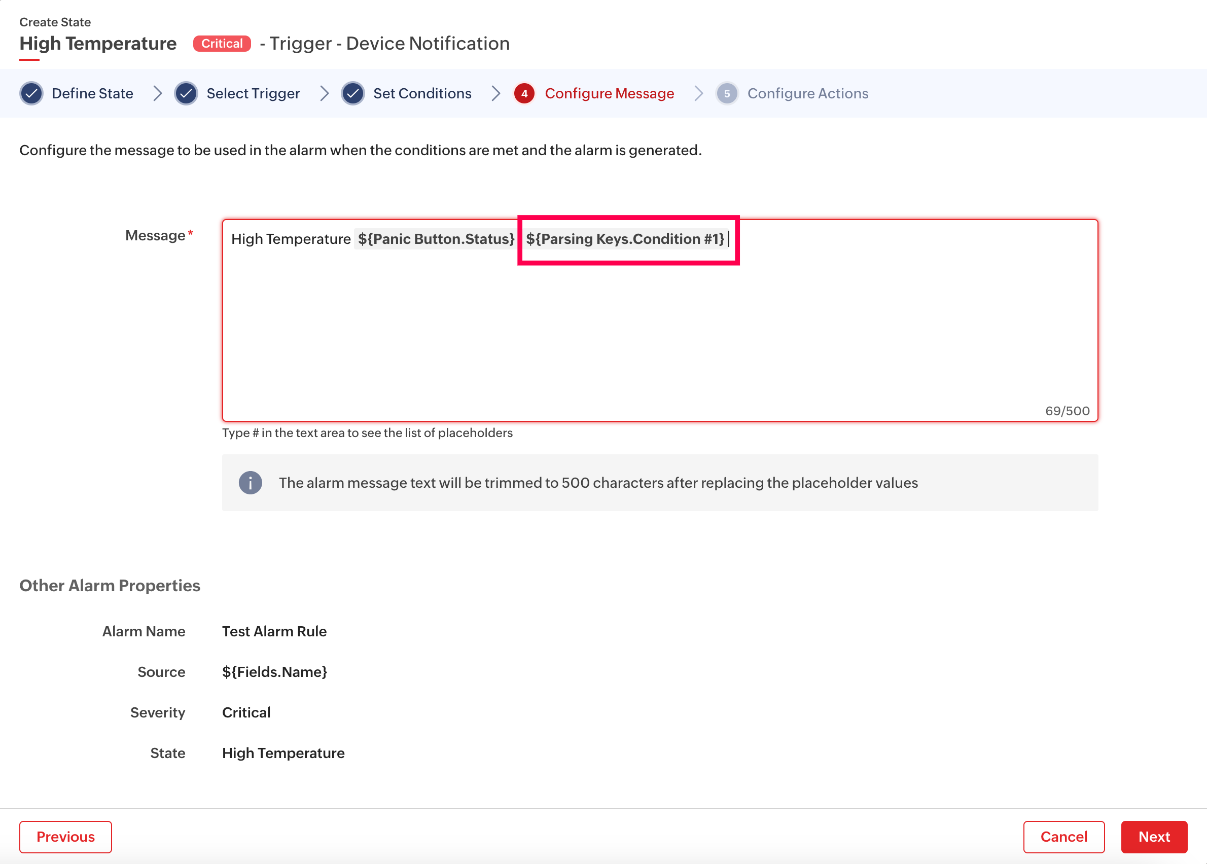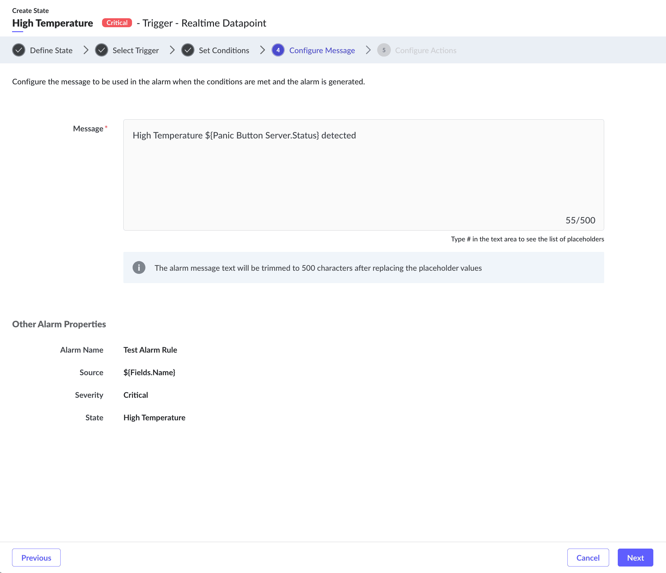 4. Click Next to move to the Configure Message screen of the Alarm Rule builder.