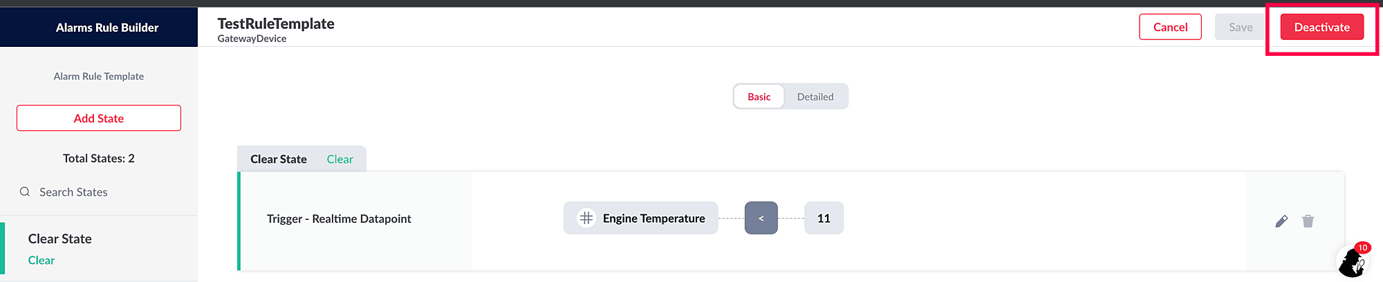 3. Click on the Deactivate button at the top right corner of the screen to deactivate the alarm rule template.