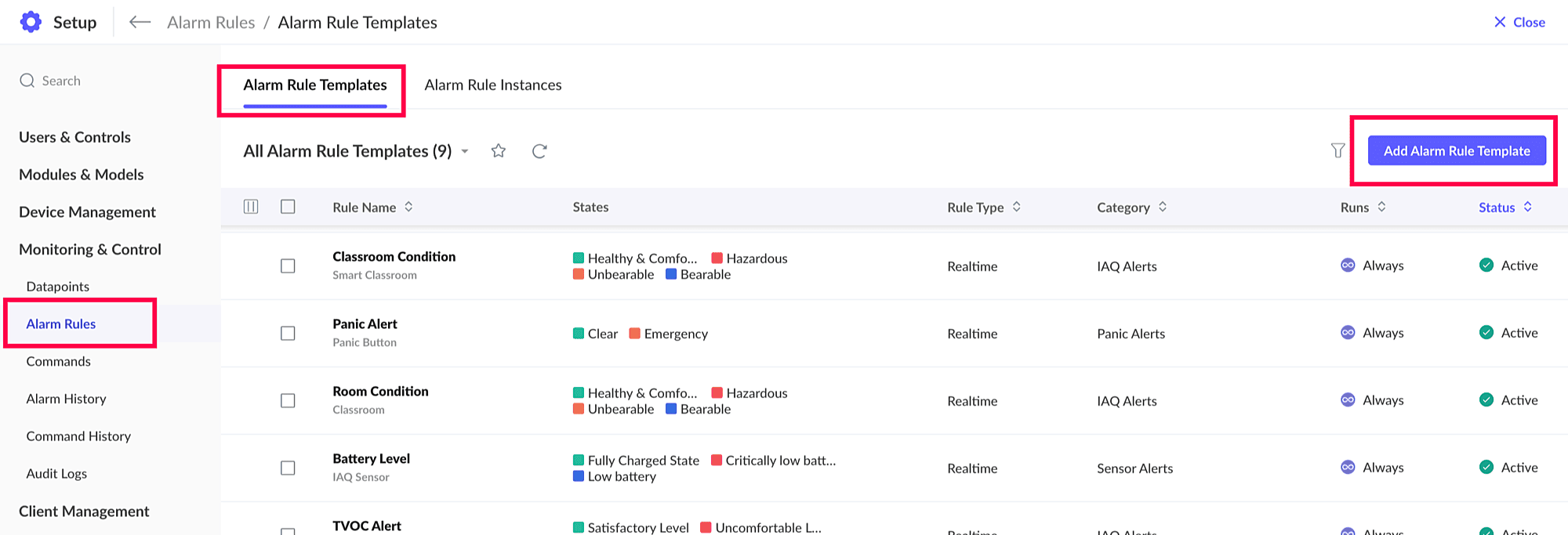 2. Click on the Alarm Rules option under the MONITORING & CONTROL section. The Alarm Rule Templates and Alarm Rule Instances (Alarm Rules) are displayed.