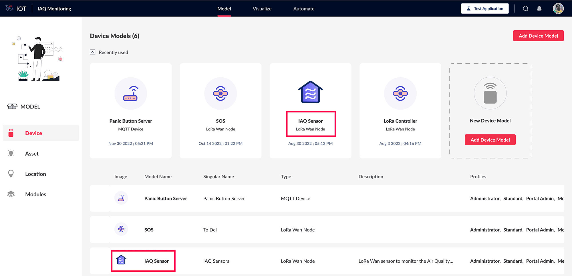 1. Click Devices in the left pane in the Model tab in the Developer App. The list of devices will be displayed in the Device Models list view.
