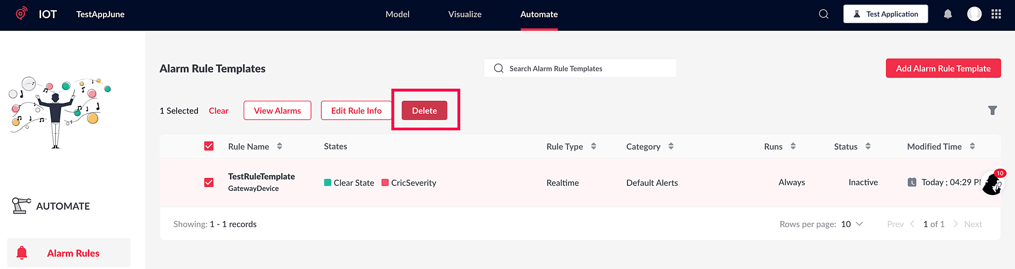 3. Select the checkbox against the name of the Alarm Rule Template that you want to delete.