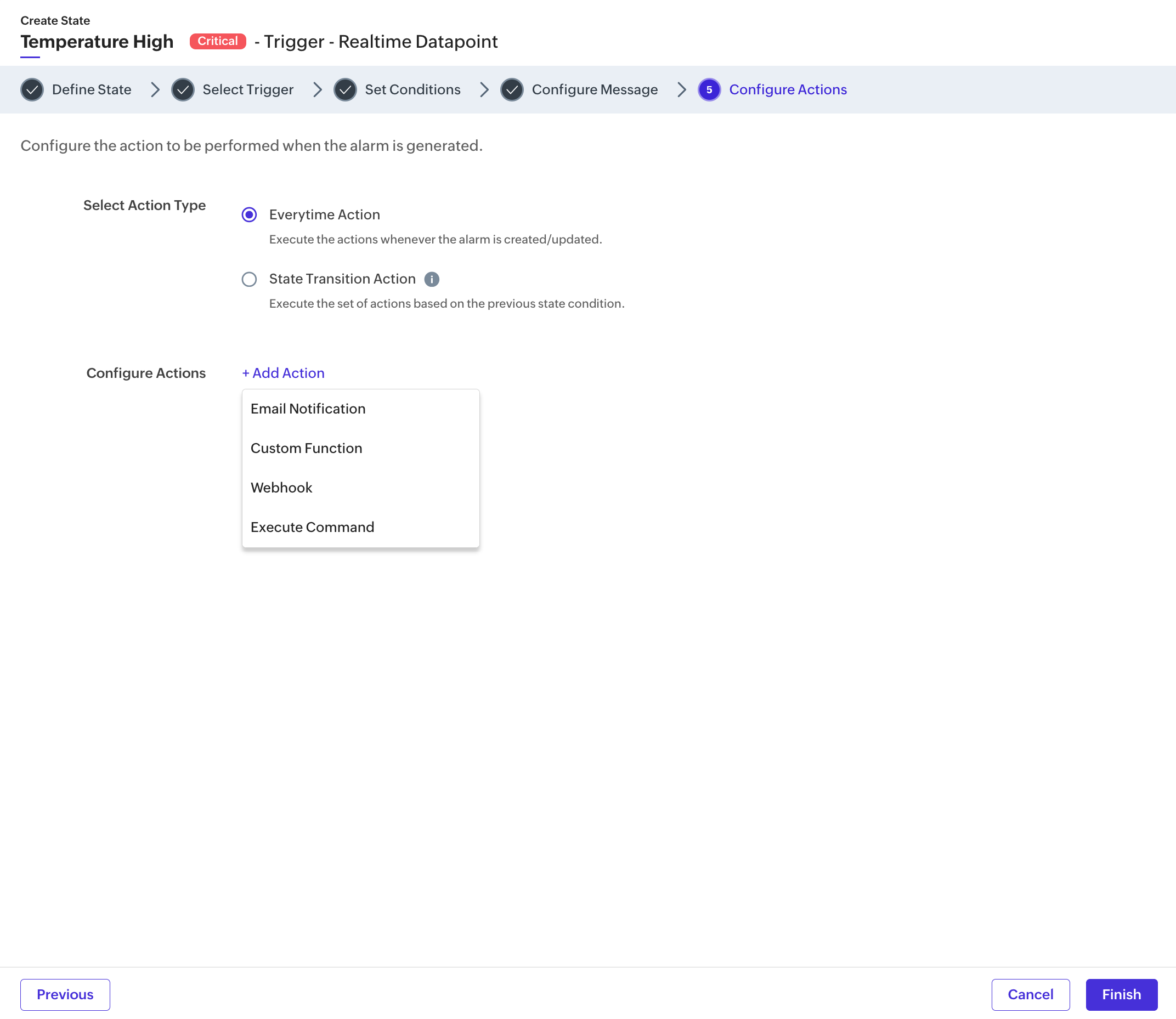 Understanding Actions documents to learn more about the actions that can be configured in the application. The actions can be configured directly from the features such as Alarm Rules,