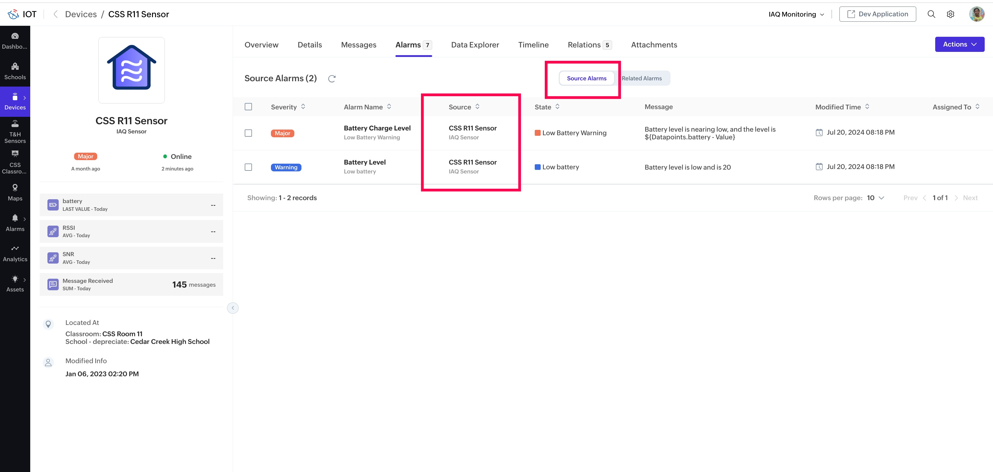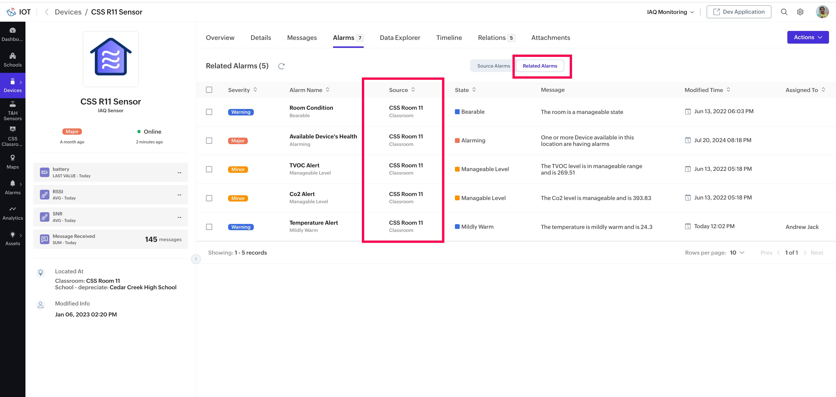 The 'Source' column in the filter option can be used to filter and view alarms that originated from a particular source. You can filter using two options: either the source is 'Located At' a specific location, or 'Under' that location and its hierarchy.