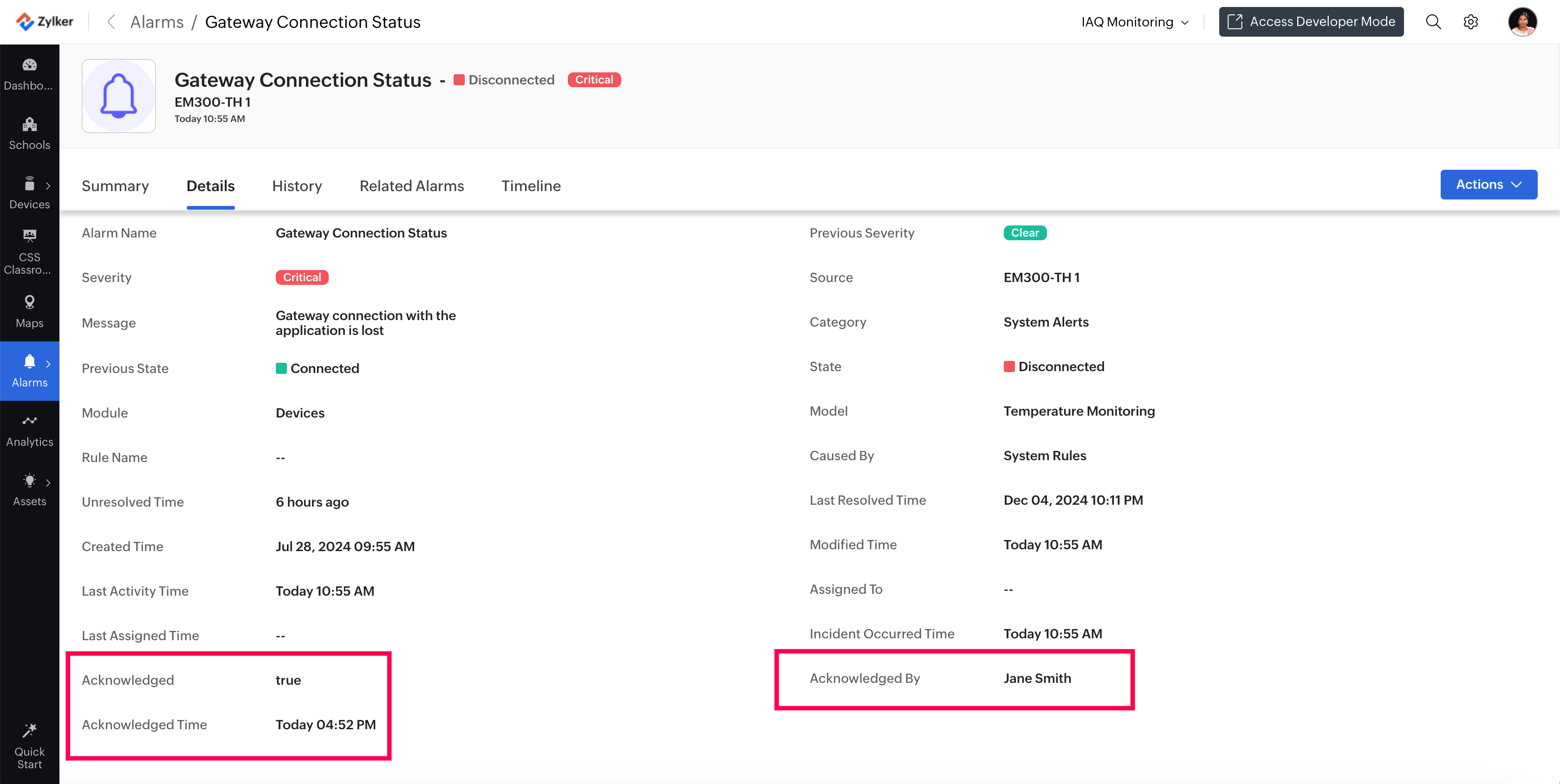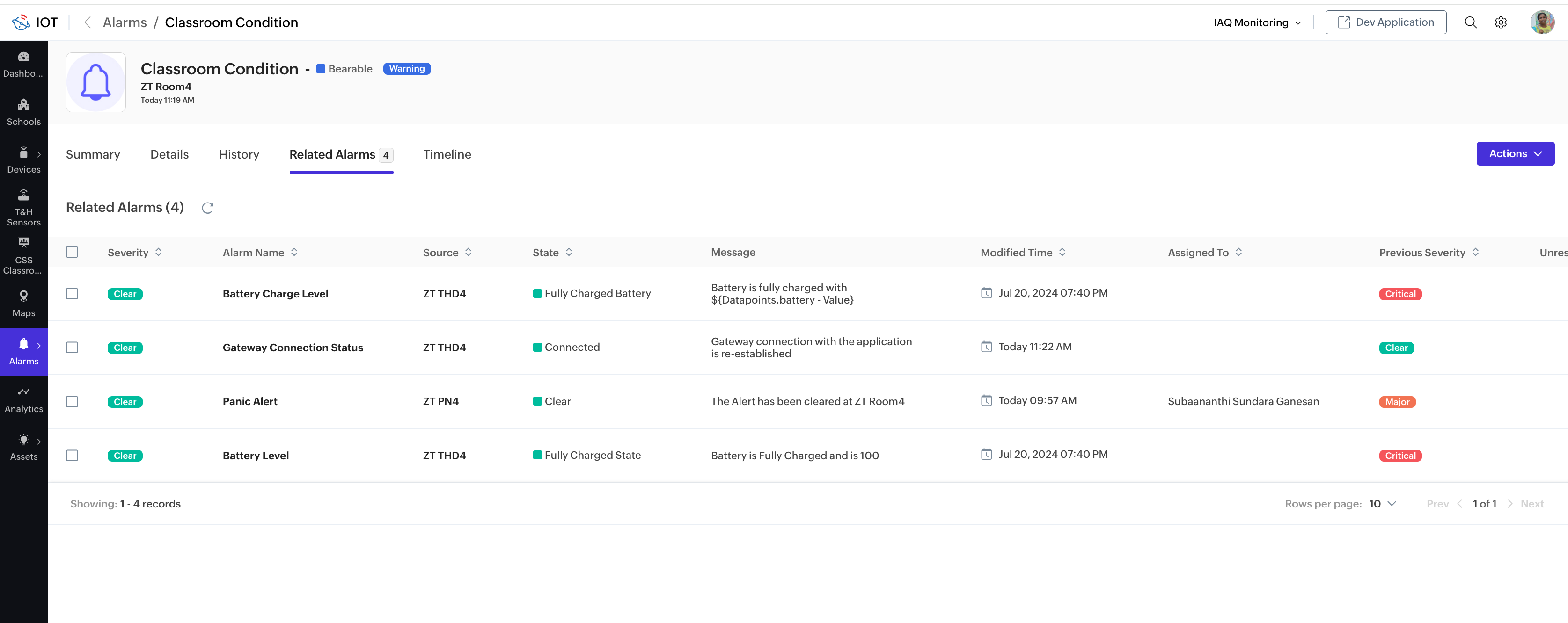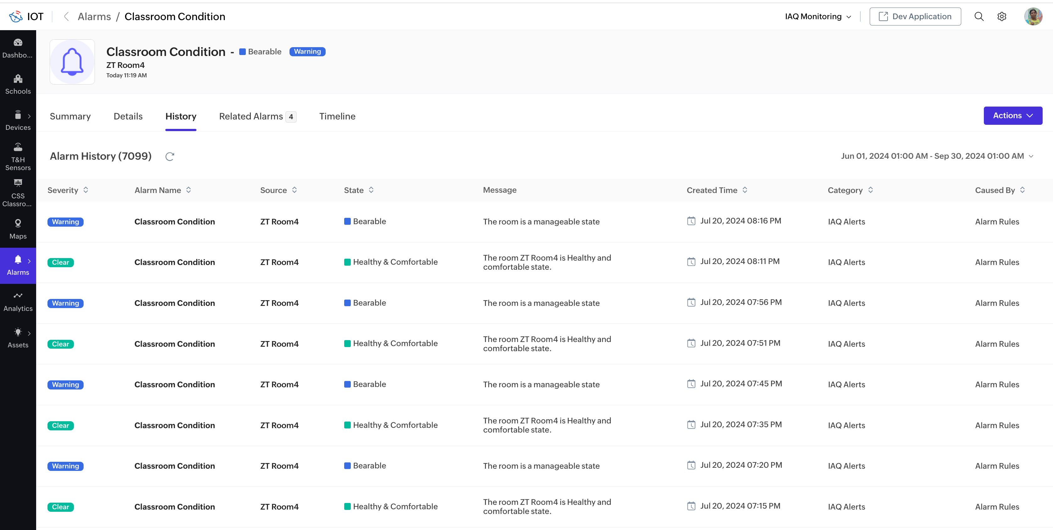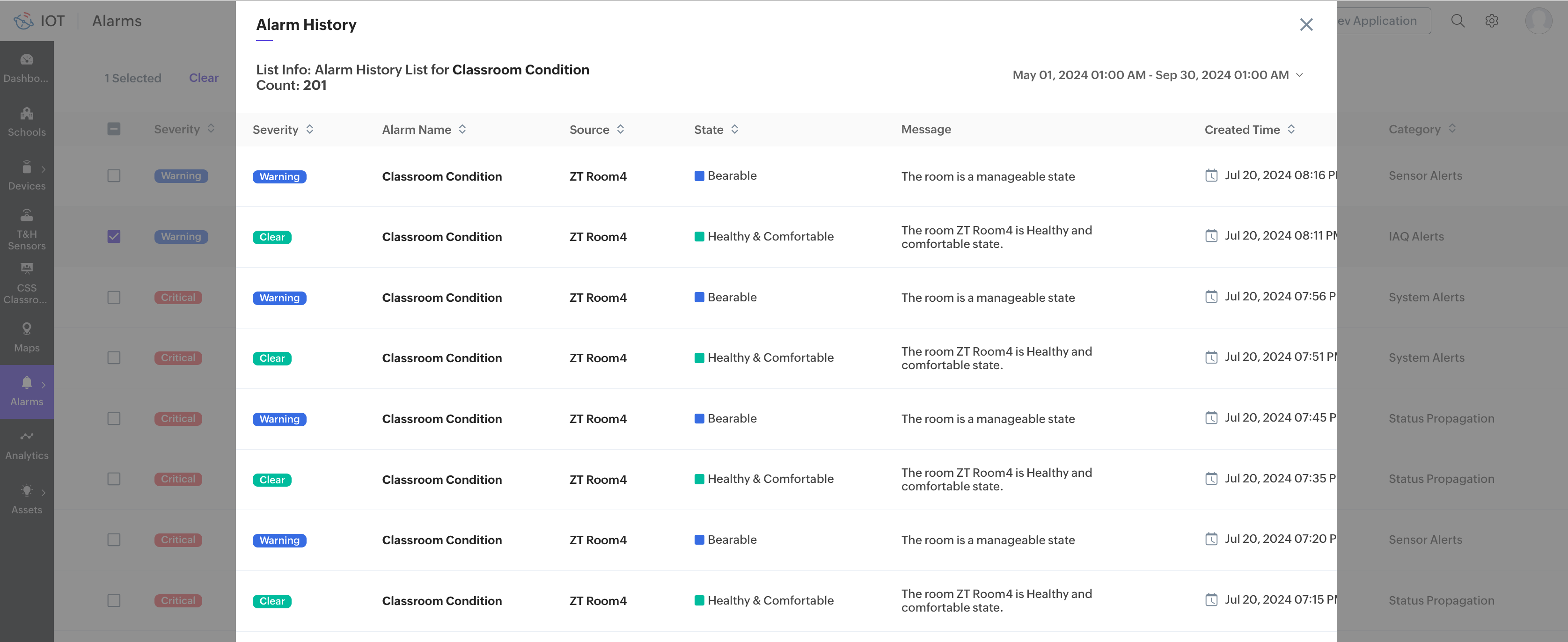 Note: Alarm history for a managed entity can also be viewed from the respective managed entities list view i.e. devices, assets, or locations list views by selecting the managed entity and clicking on the View Alarm History button on top of the list view.