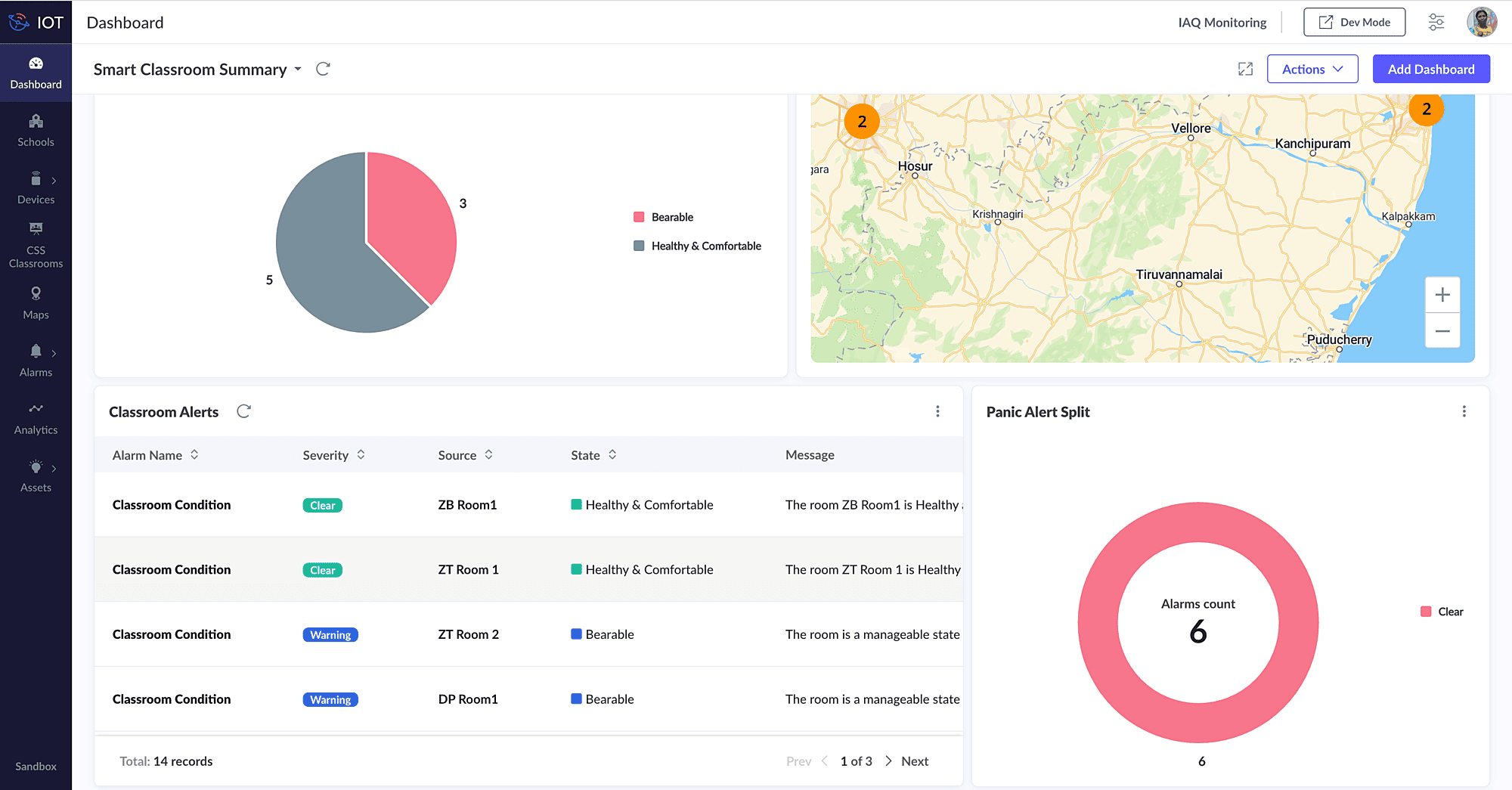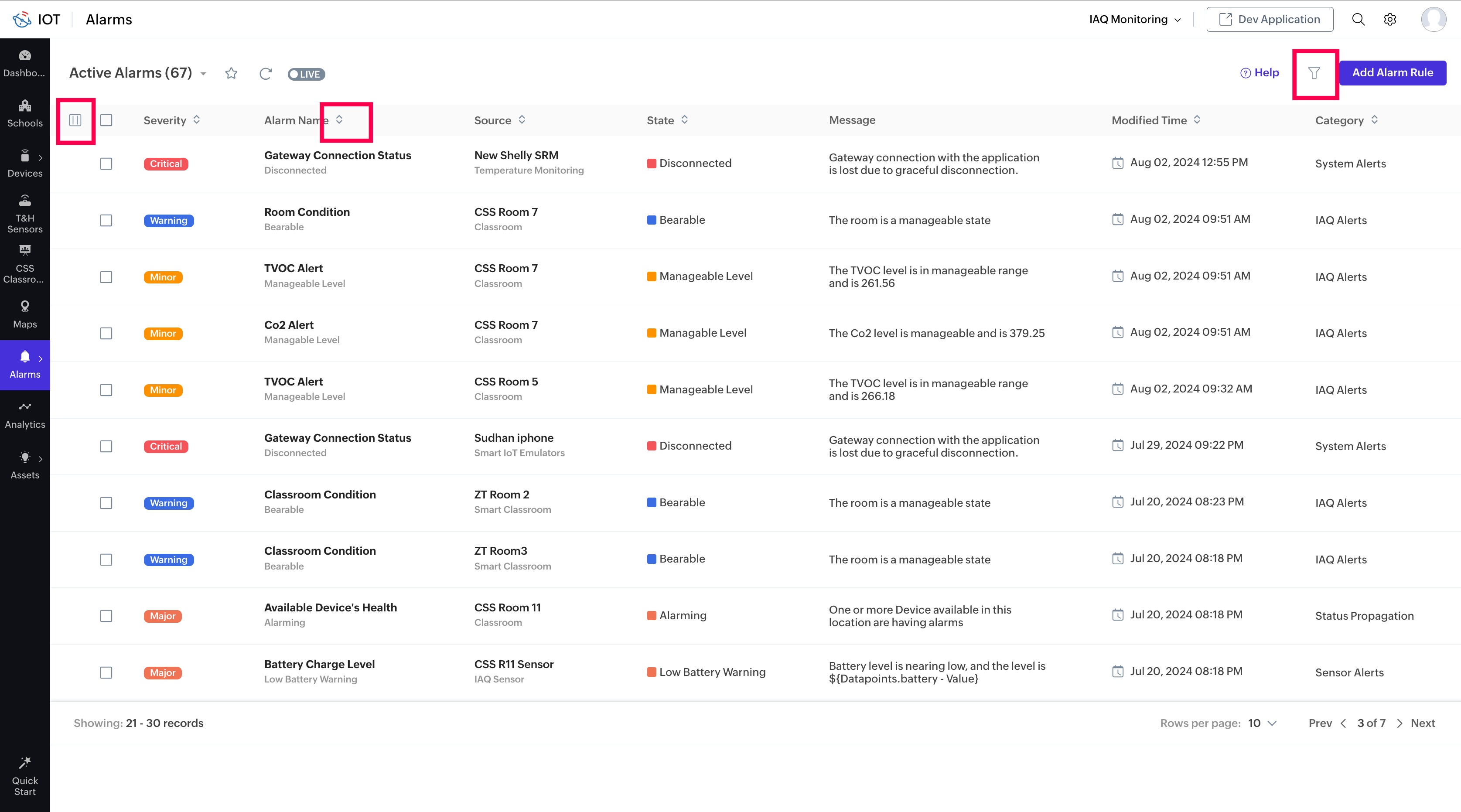 By default, all alarms in the application are displayed in the list view. The list view contains all the generated alarms and selective details about each, in a tabulated view as displayed below.The list view offers the following customization options: