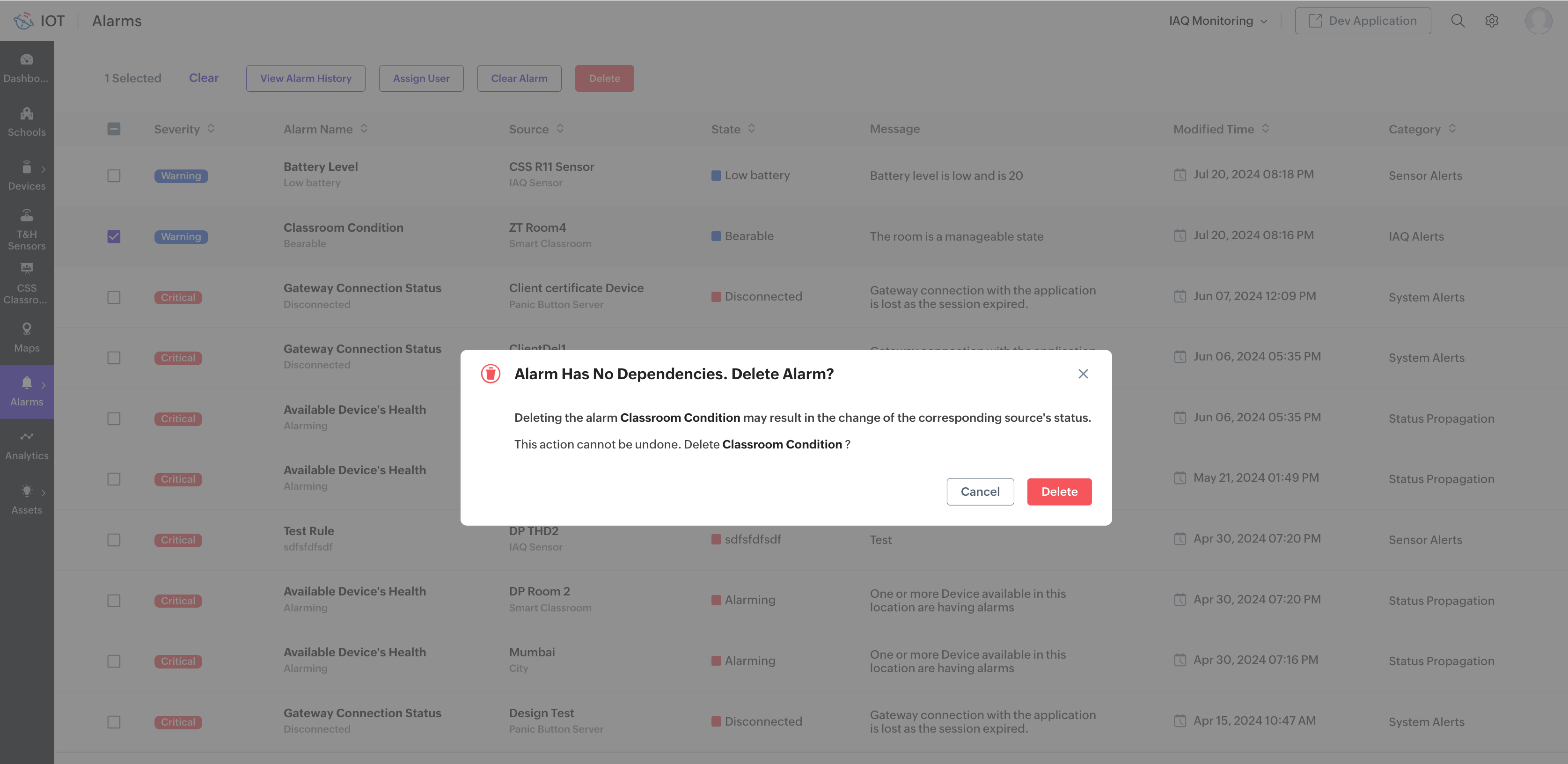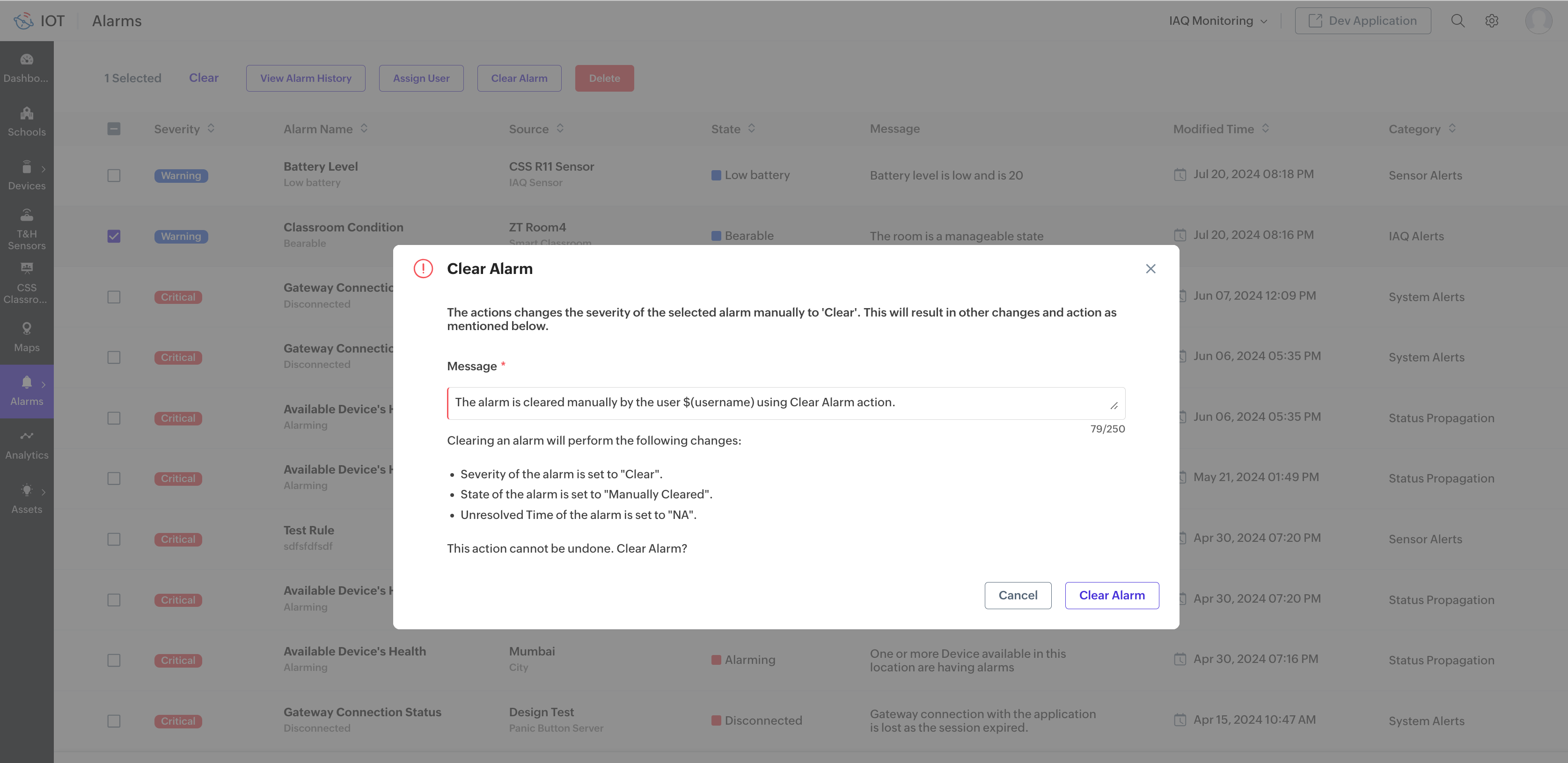 Info: Typically, the system automatically clears an alarm when the fault is resolved and the same will be reflected in the application. In rare cases, when the fault has been rectified but the alarm remains uncleared, you can manually clear the alarm using the Clear Alarm option.