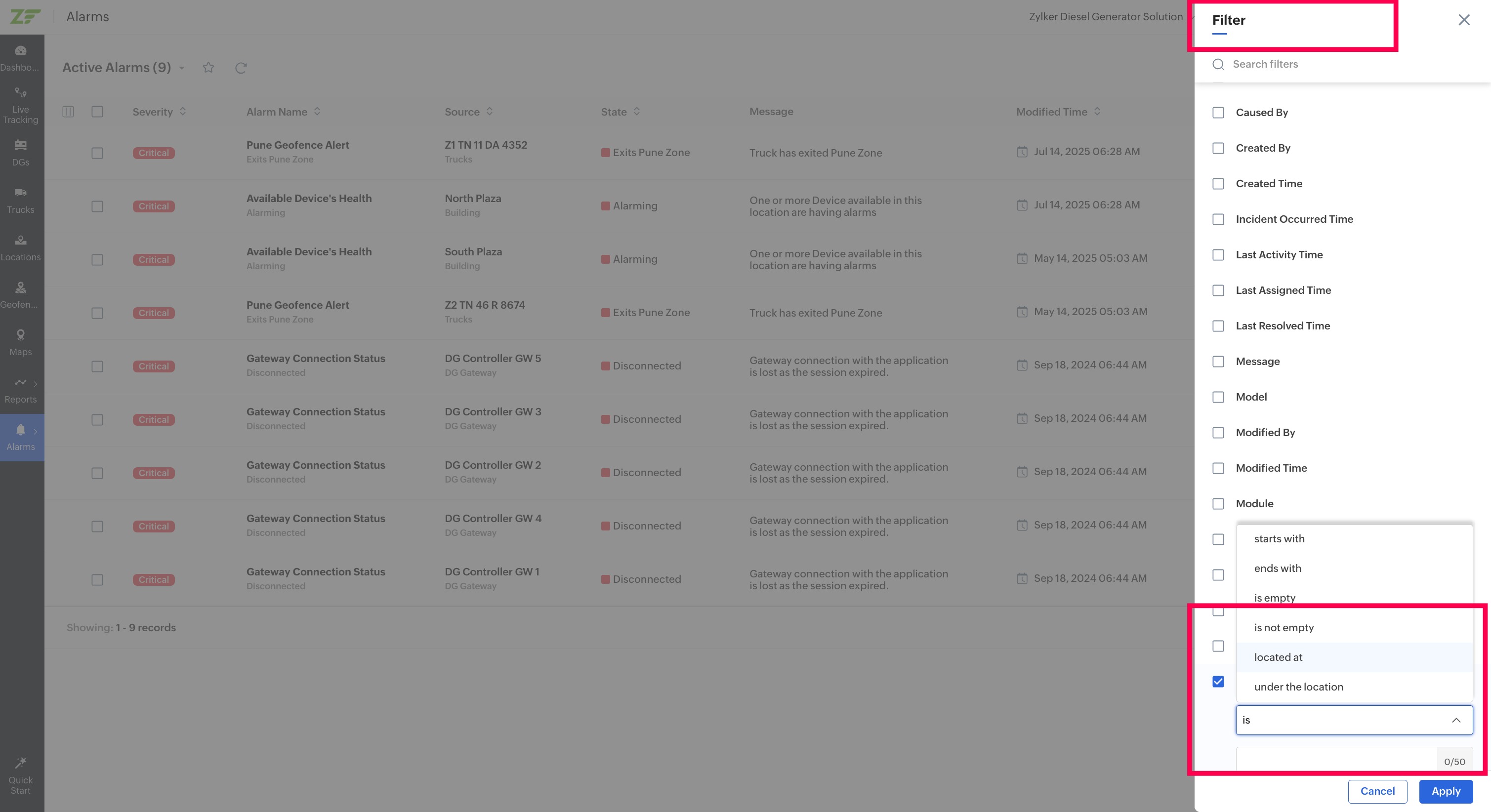 Source → Located At → North Plaza Main.Now, assume there are two other locations under North Plaza Main: West Wing, where DG3 is located, and East Wing, where DG4 is located. To view alarms that originated from the DGs present at North Plaza Main, West Wing, and East Wing, you can filter using: