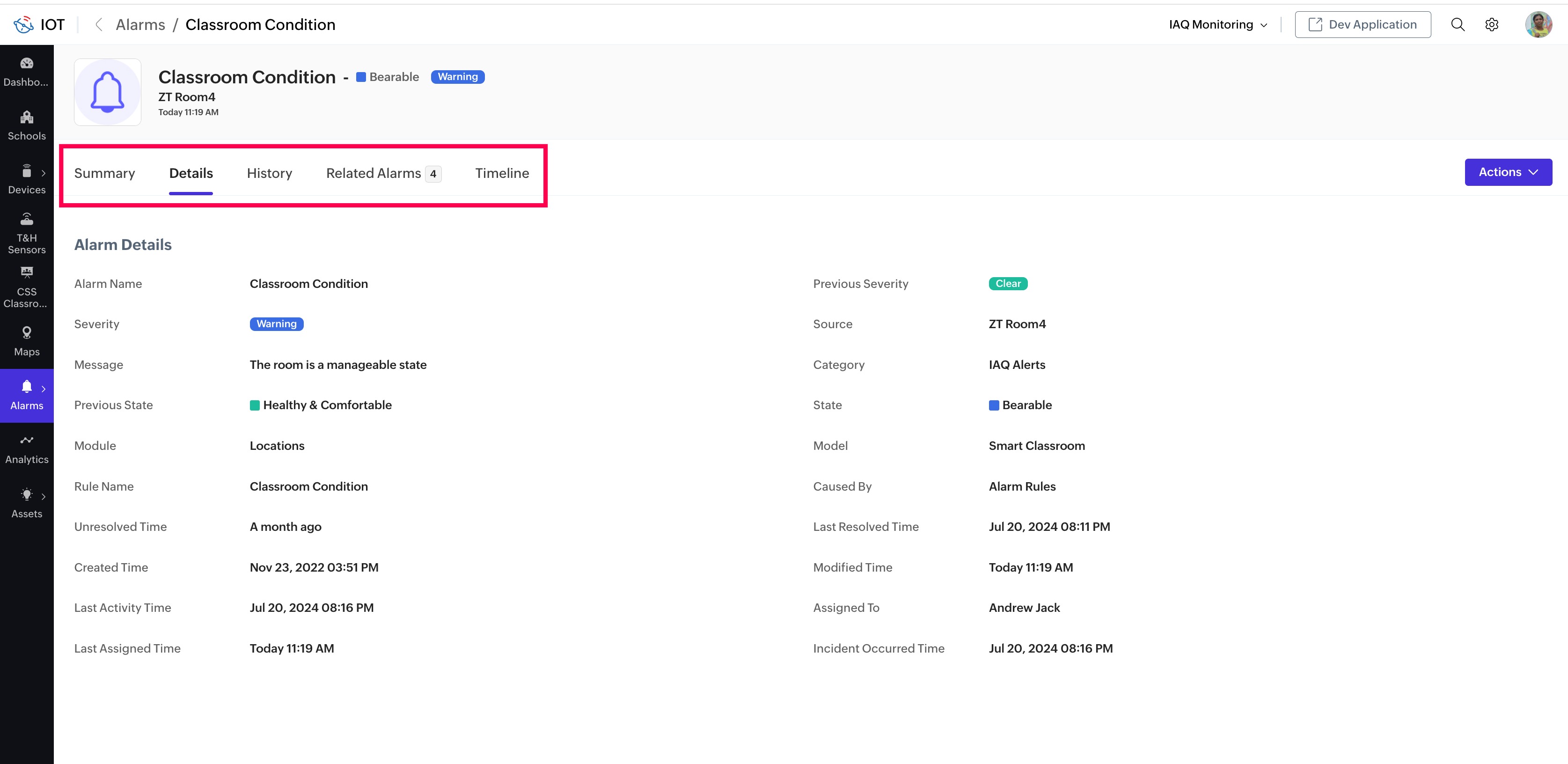 Tab Description Summary Displays the summary of the Alarm in a dashboard view with widgets. This is also known as the overview dashboard view of the alarm.Alarm Details Displays properties of an alarm such as alarm created time, modified time, severity, state, category, etc.History Displays the occurrence order of the alarm with its severity.Related Alarms Displays the list of related alarms.Timeline Displays the list of activities performed on the alarm in chronological order.
