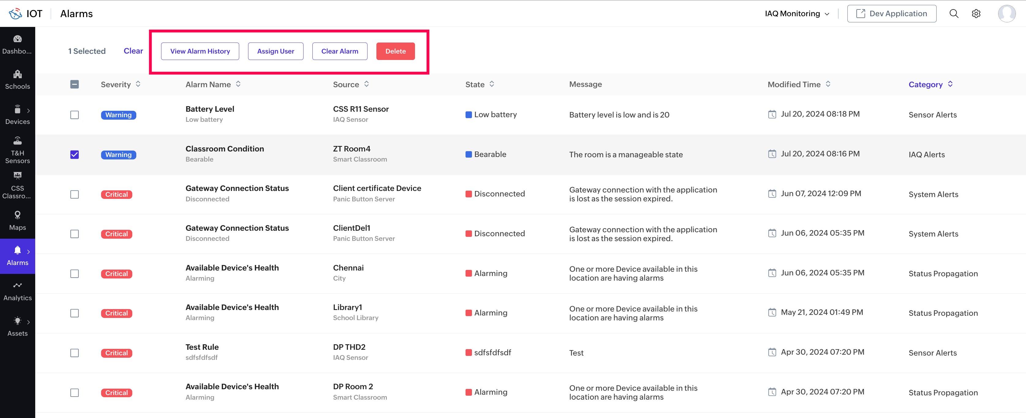 The actions that can be performed from the list view are highlighted with separate screenshots for each action below.Viewing Alarm History