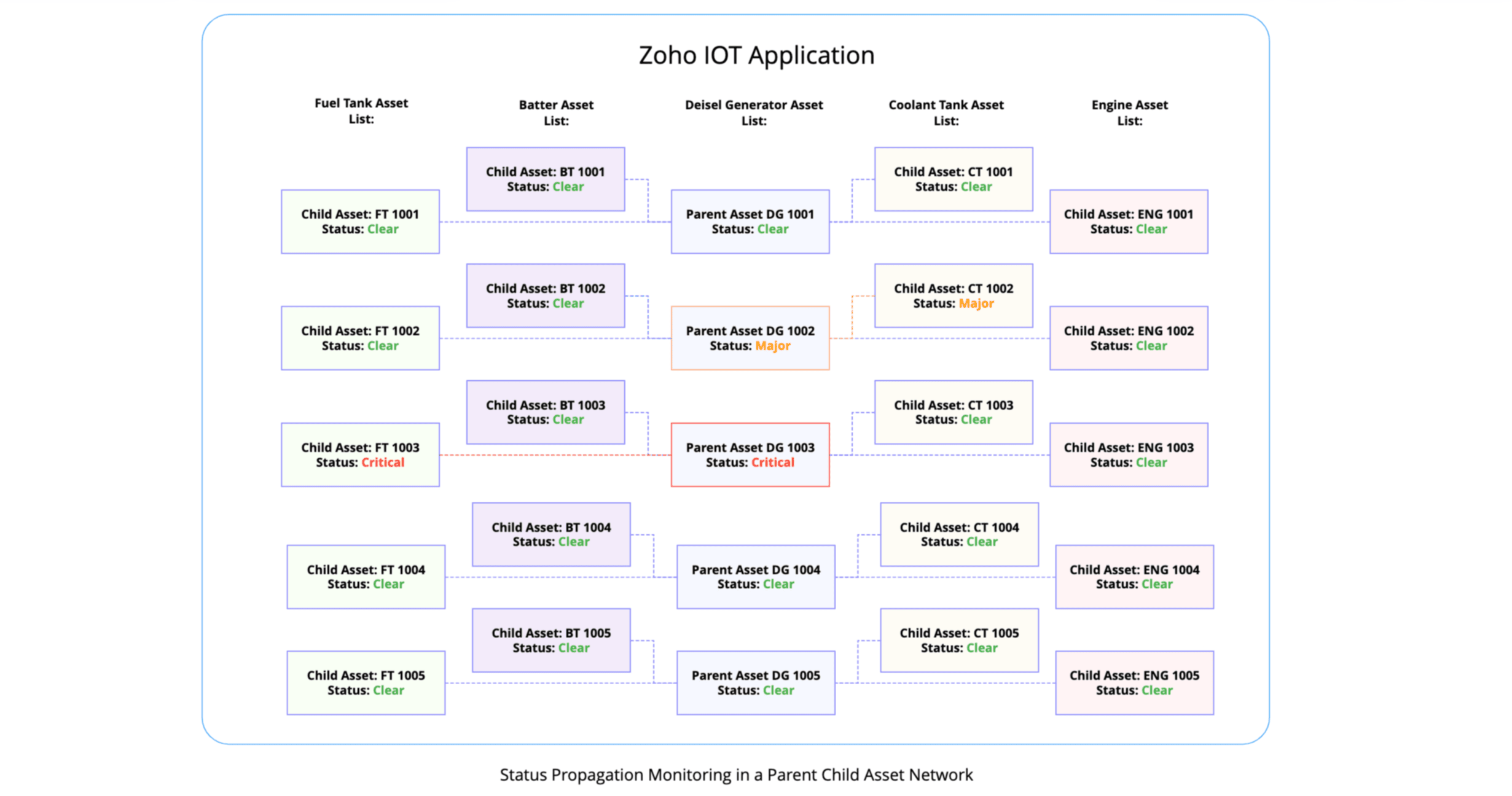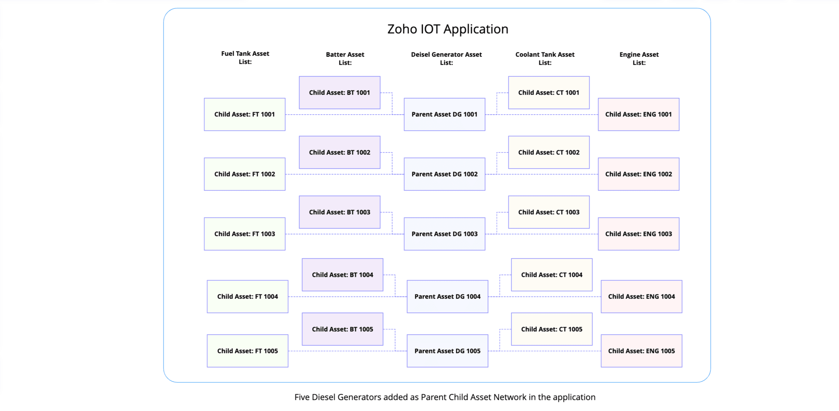 When managing assets, particularly of complex resources comprising multiple components, using an organized and effective monitoring system is crucial. Zoho IoT applications facilitate effective management of such systems by allowing the creation of hierarchical relationships between assets, forming a Parent-Child Asset Network. This network simplifies the oversight of components that together constitute a larger resource. Structure of Parent-Asset Network.