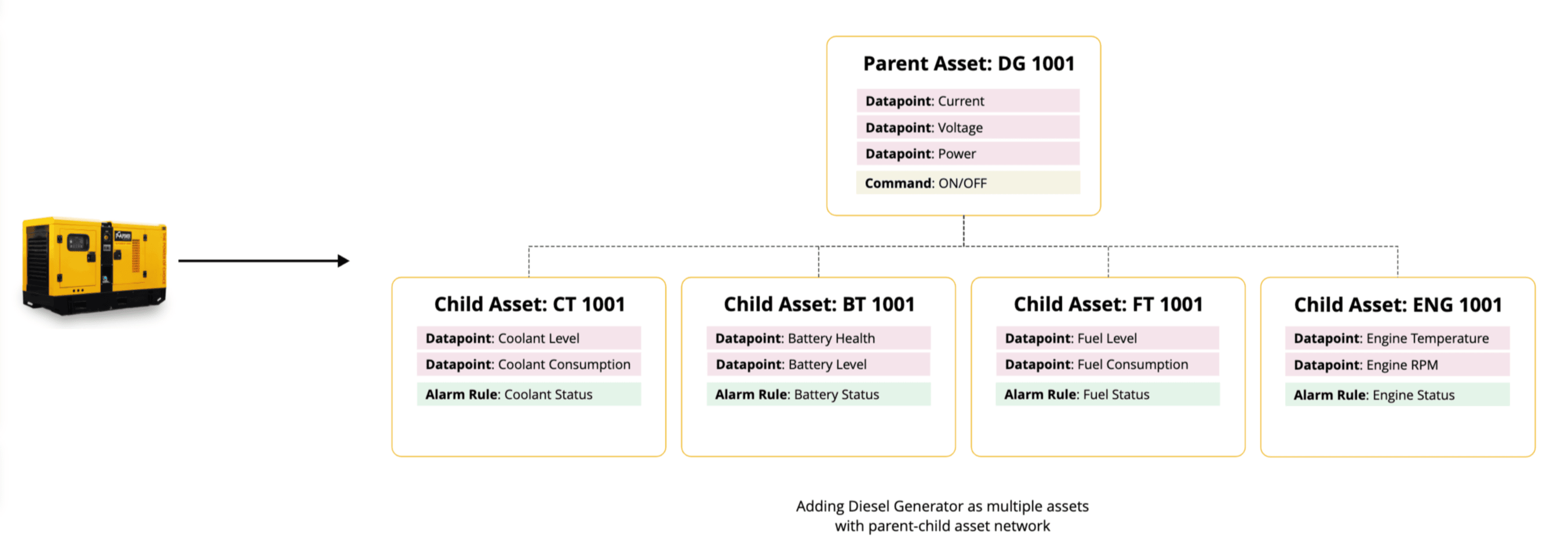 By utilizing a Parent-Child Asset Network, each component of the diesel generator is created as an asset and then designated as a child asset under the diesel generator (the parent asset). This configuration allows for the individual monitoring of each component, making the management process more straightforward and efficient.