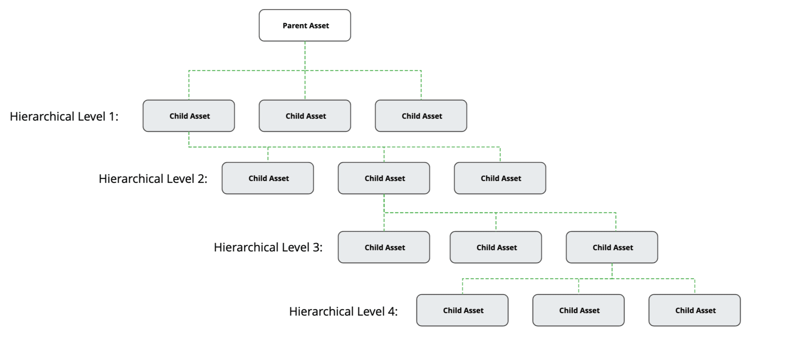 A child asset can itself be a parent to other assets, supporting up to four levels of hierarchy.