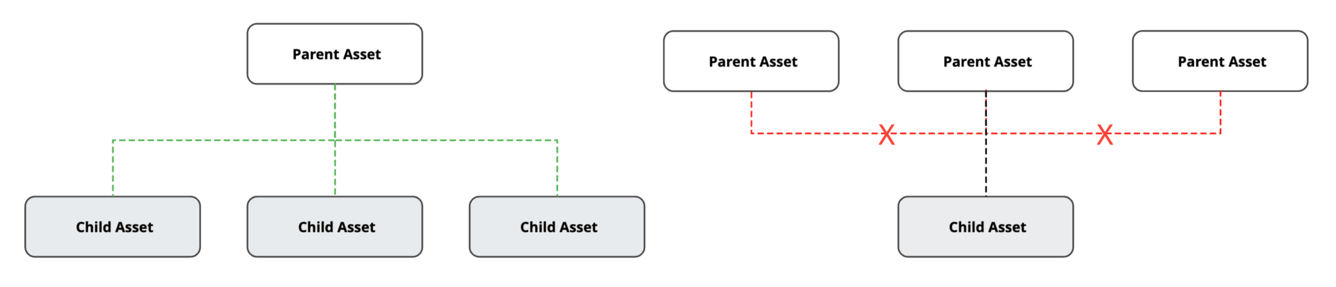 Each parent asset can have multiple child assets linked to it, but a child asset is limited to a single parent.