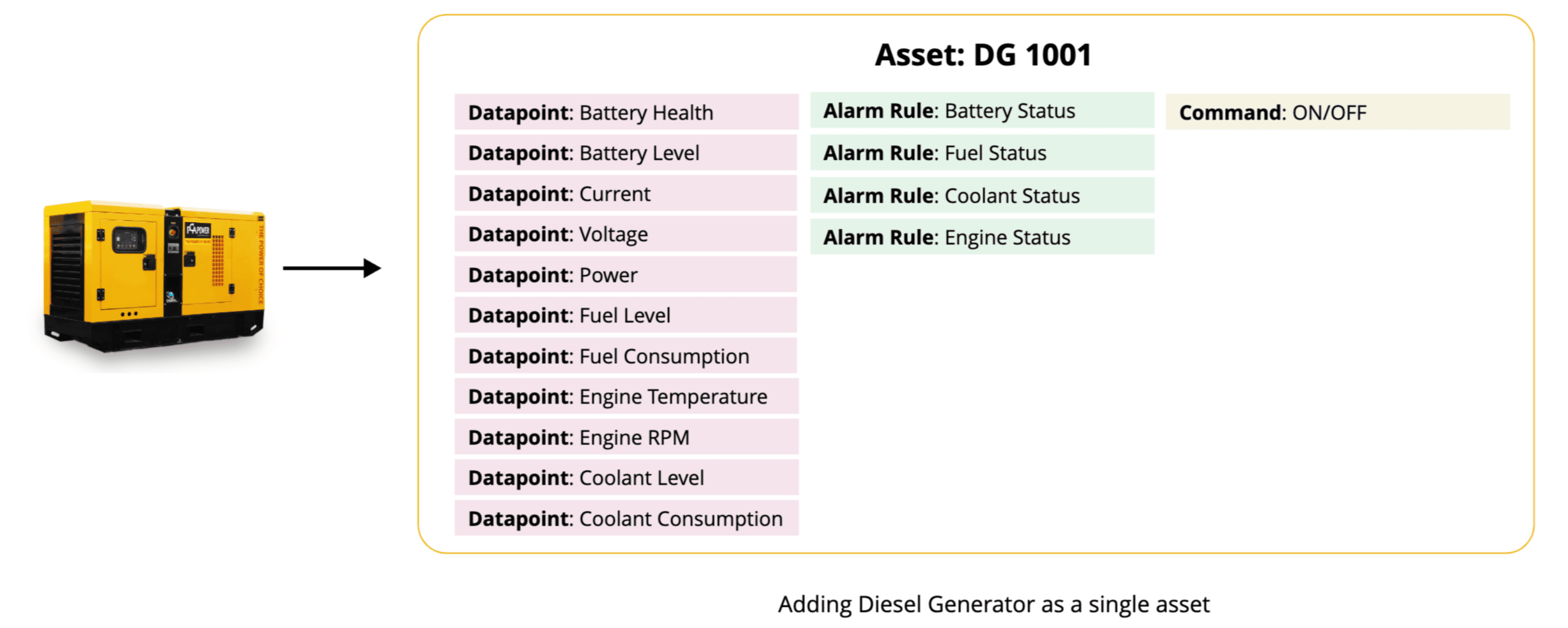 Assets, like a diesel generator, are typically composed of multiple subcomponents such as an Engine, Fuel Tank, Coolant Tank, and Battery. Monitoring such an asset as a single unit can lead to a complicated and cluttered configurations. This complexity arises because all datapoints, commands, and alarm rules for each component are contained within a single asset.