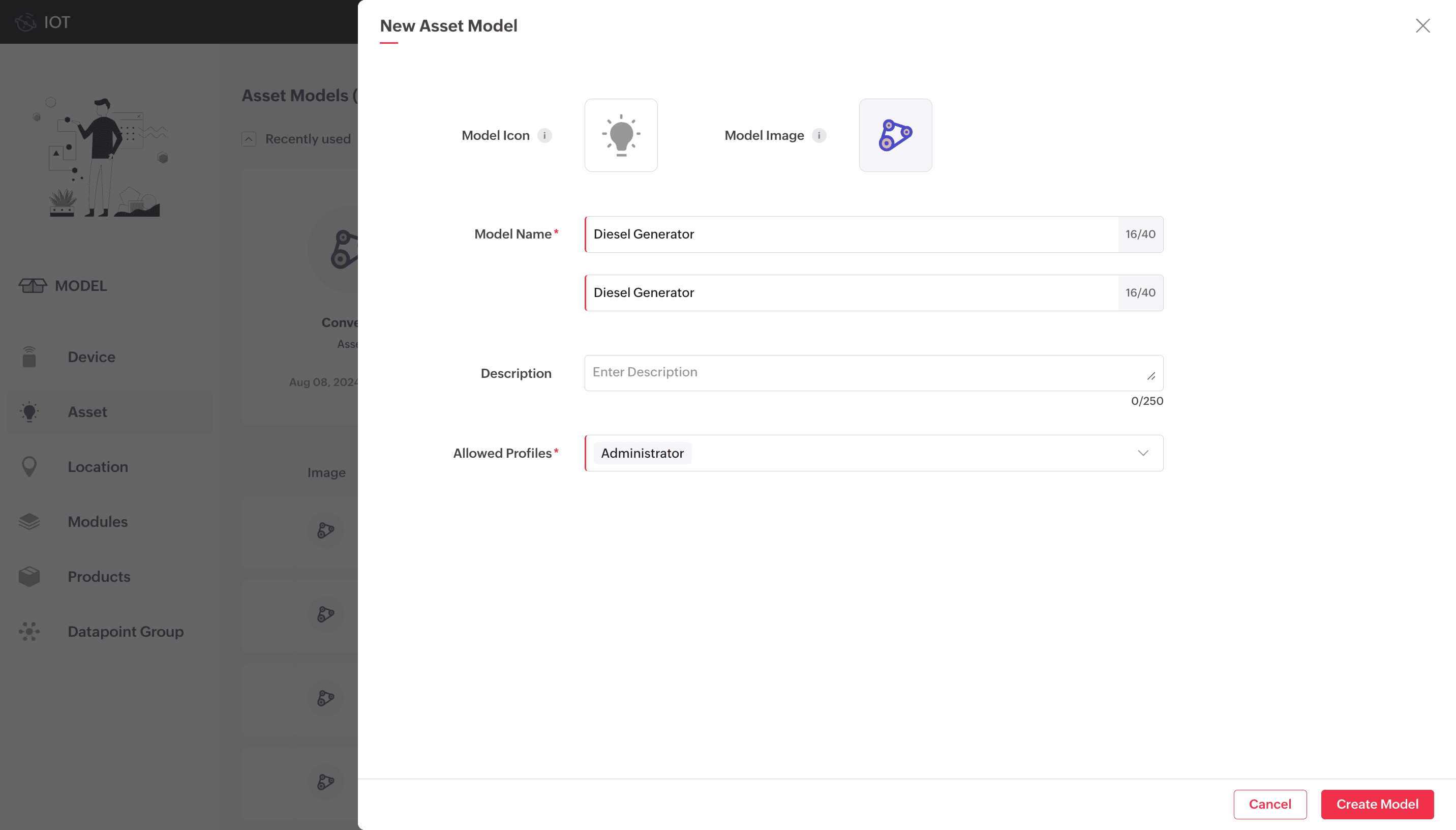 4. Provide the required values in the appropriate fields. For this illustration, a model called Diesel Generator is created.