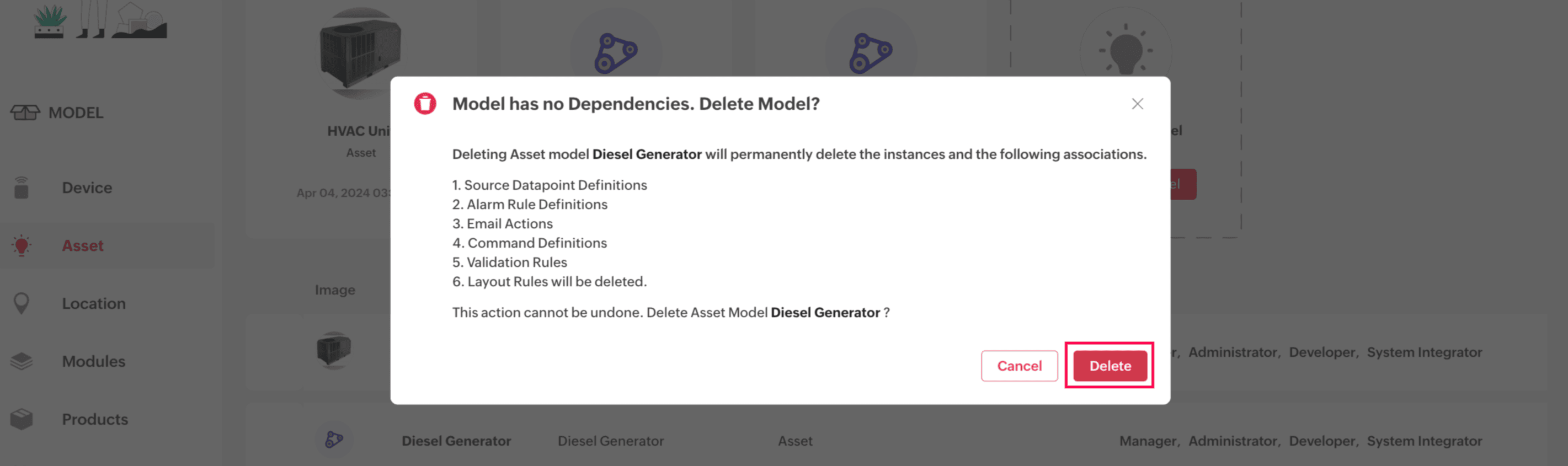 Asset Model Dependencies: When an asset is created based on a specific asset model, that asset model becomes a dependency for the asset instance. Consequently, the asset model cannot be removed while any asset instances based on it still exist. Users must delete all asset instances associated with the asset model before they can delete the asset model itself.
