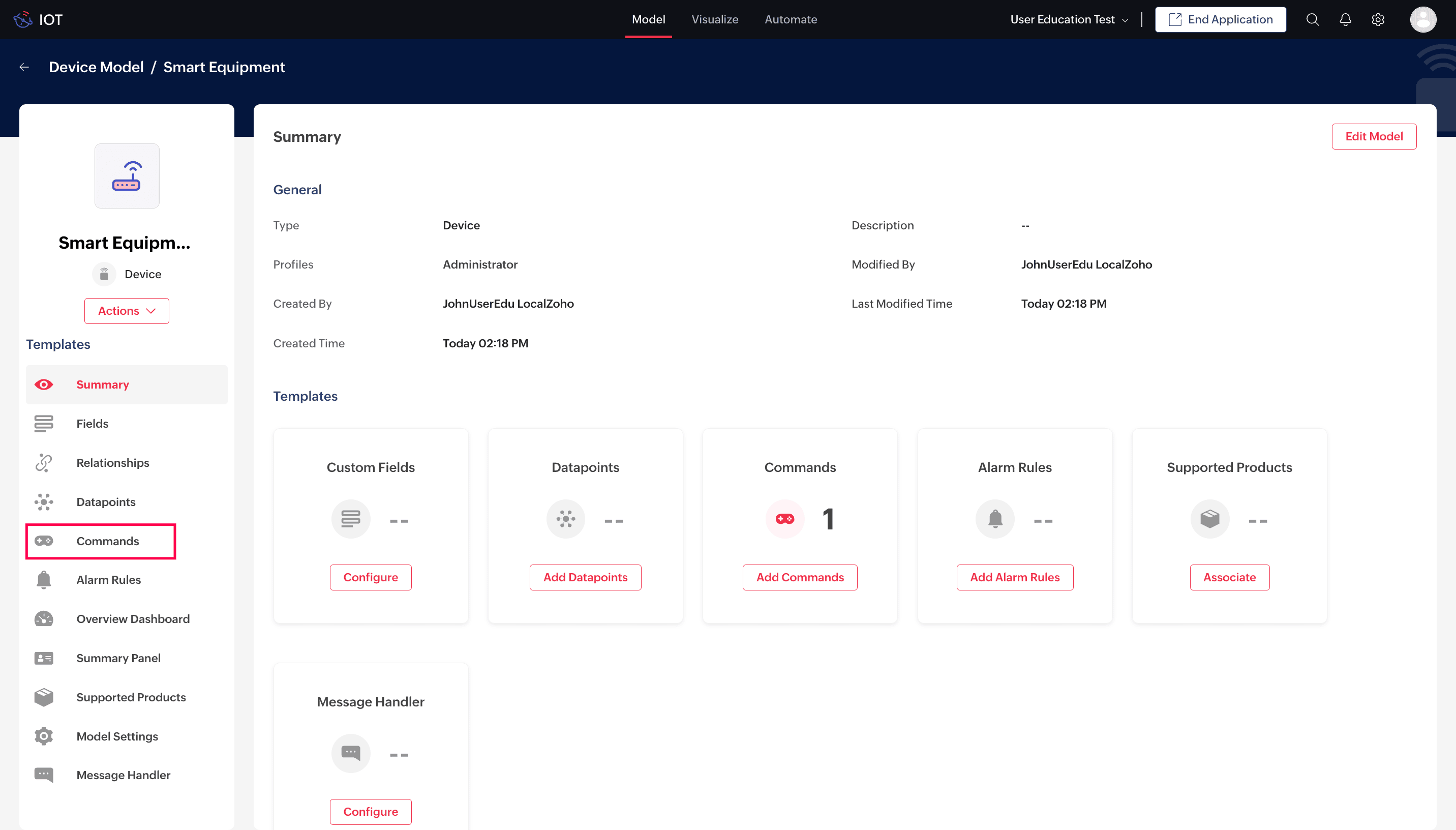 This guide explains how to add, edit, delete, and manage commands and command templates in a Zoho IOT application. Adding commands and command templates Command templates are added to a model, and the devices, assets, or locations created based on ...
