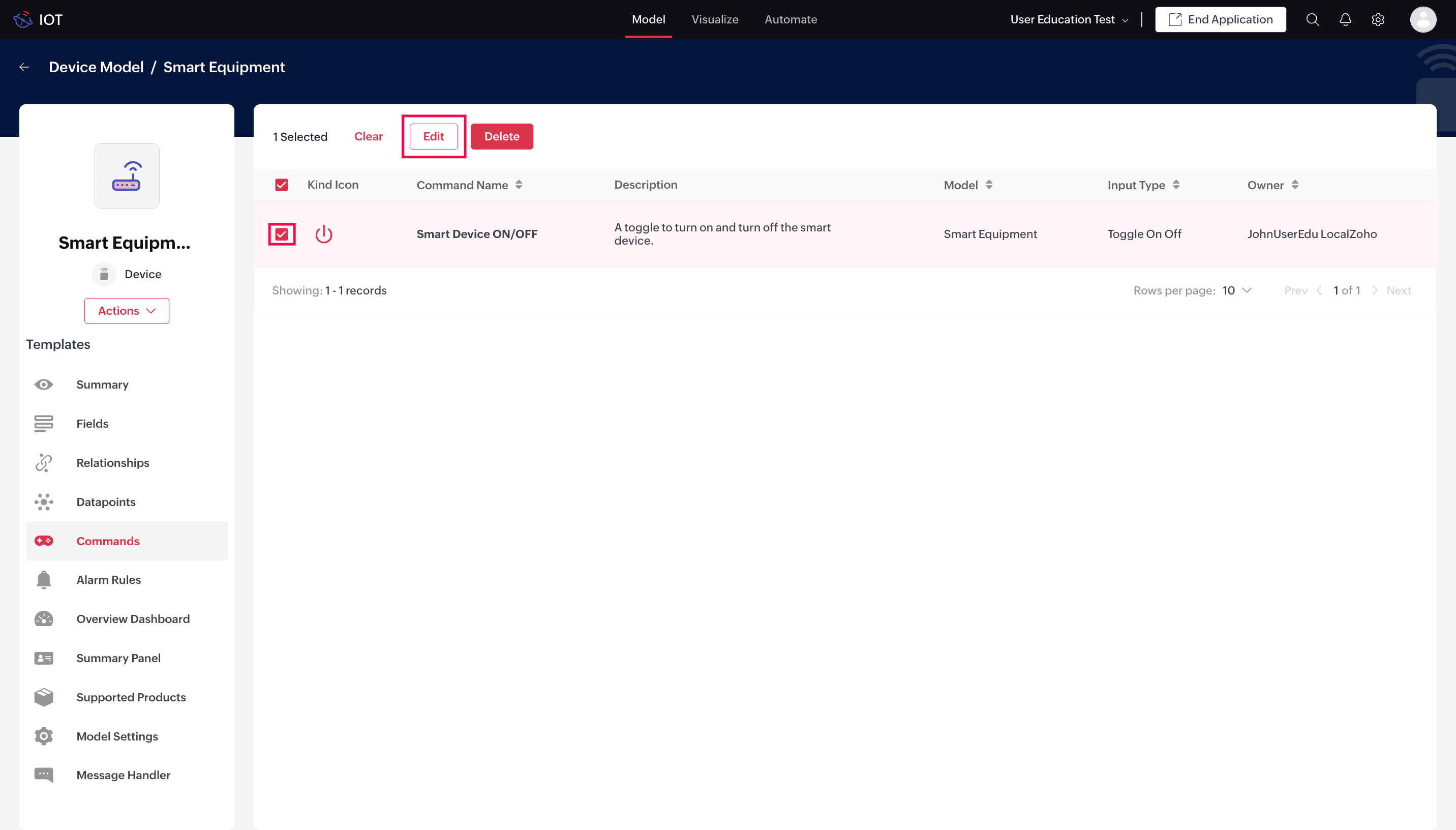 5. Check the box near the name of the command template you want to disable and click the Edit button that appears. For this illustration, the command template Smart Device ON/OFF is selected.