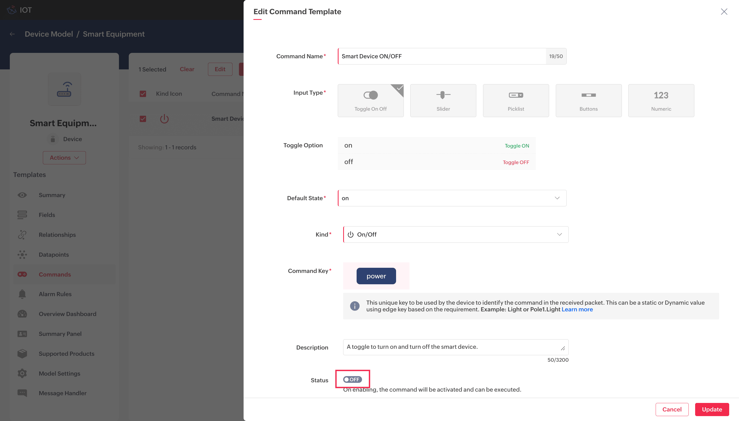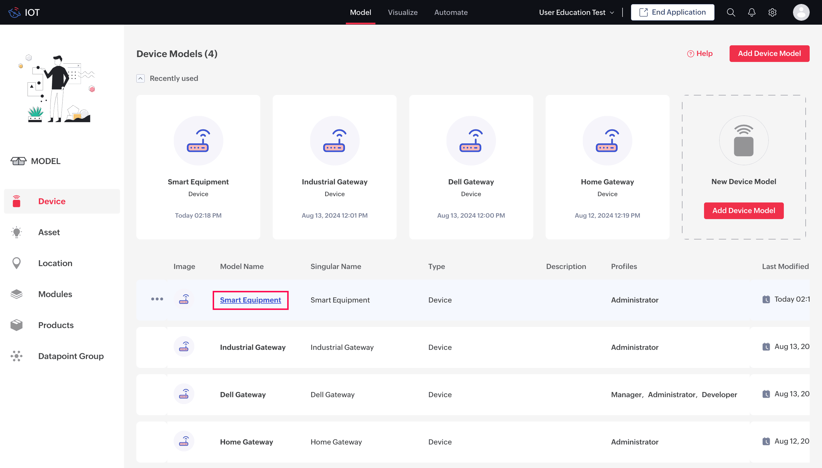 3. Click the name of the model you want to add the Command Template to. For this illustration, the device model Smart Equipment is considered.