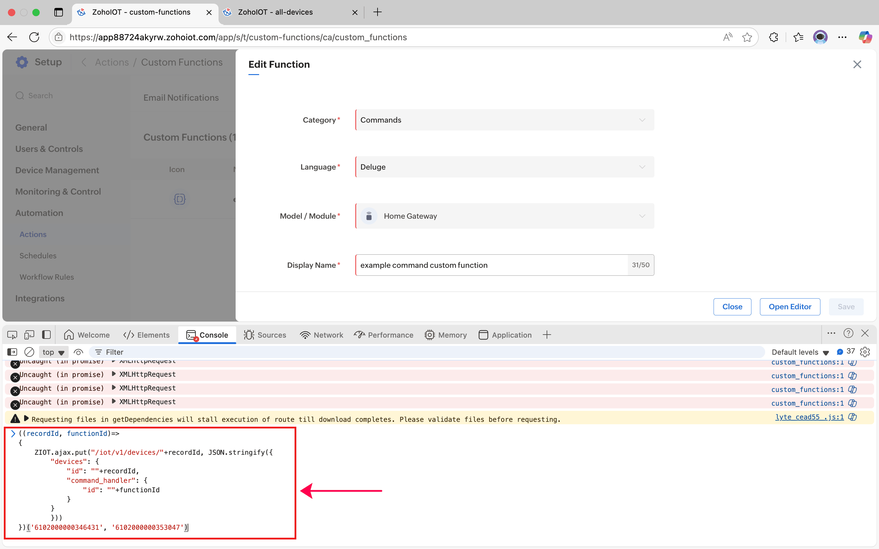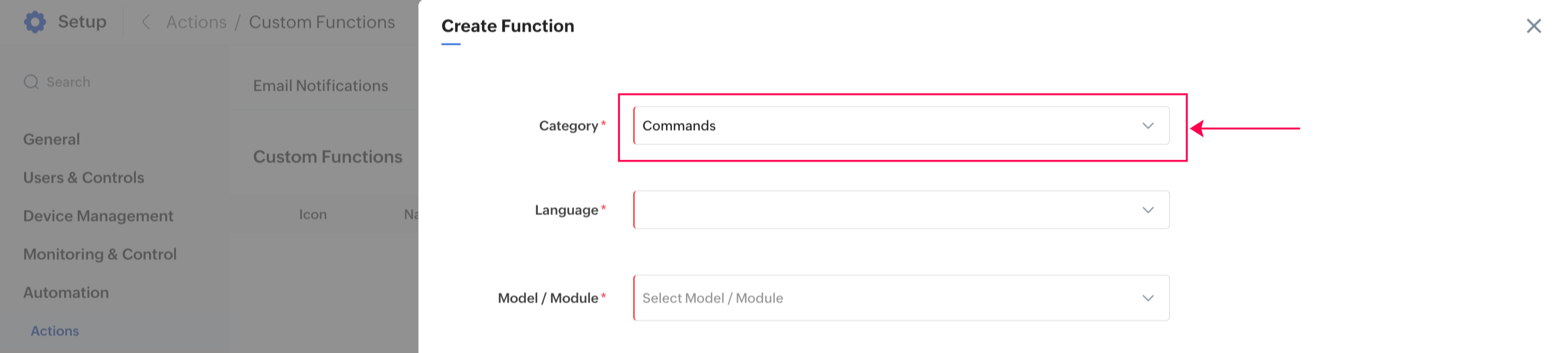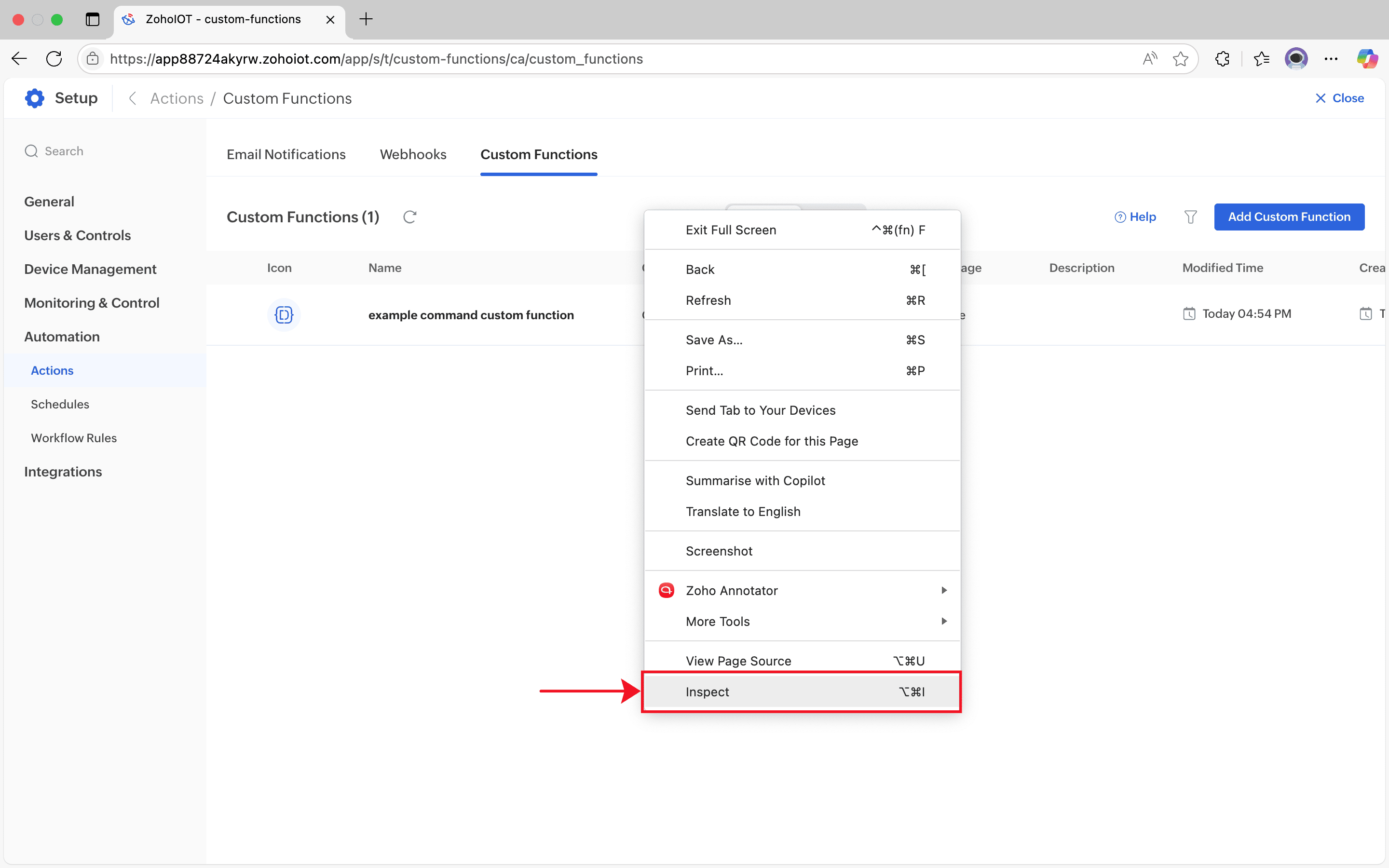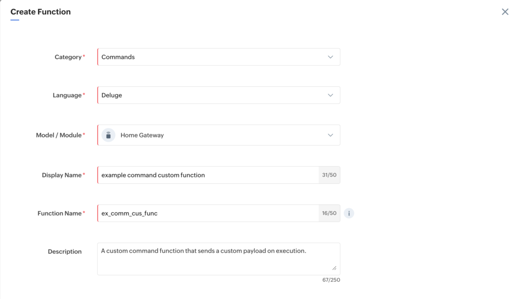Note: The Command Custom Function feature is currently in its beta stage with further enhancements planned in the product roadmap. Contact support@zohoiot.com for more details.