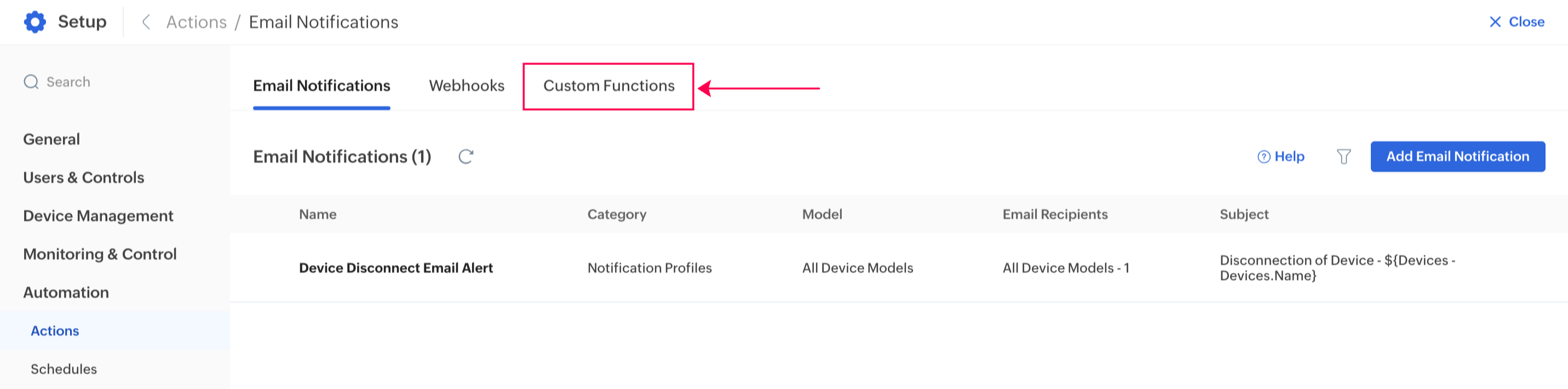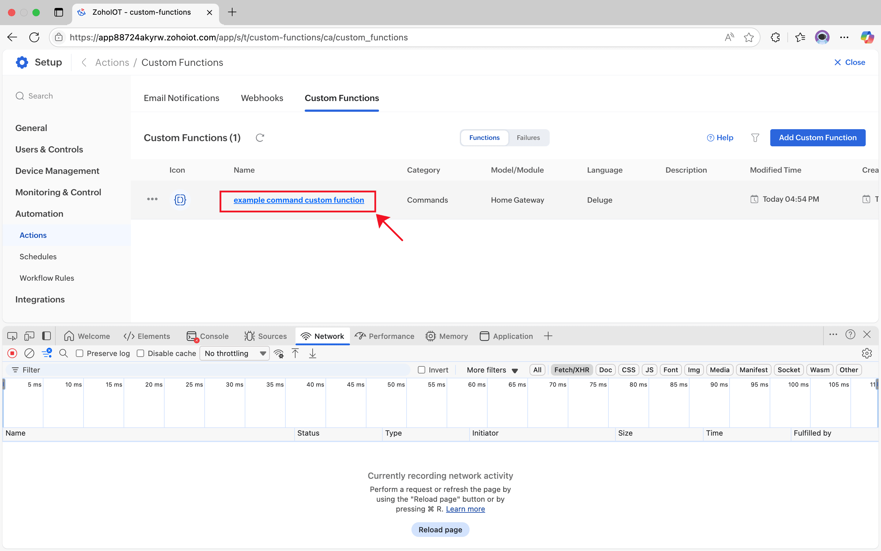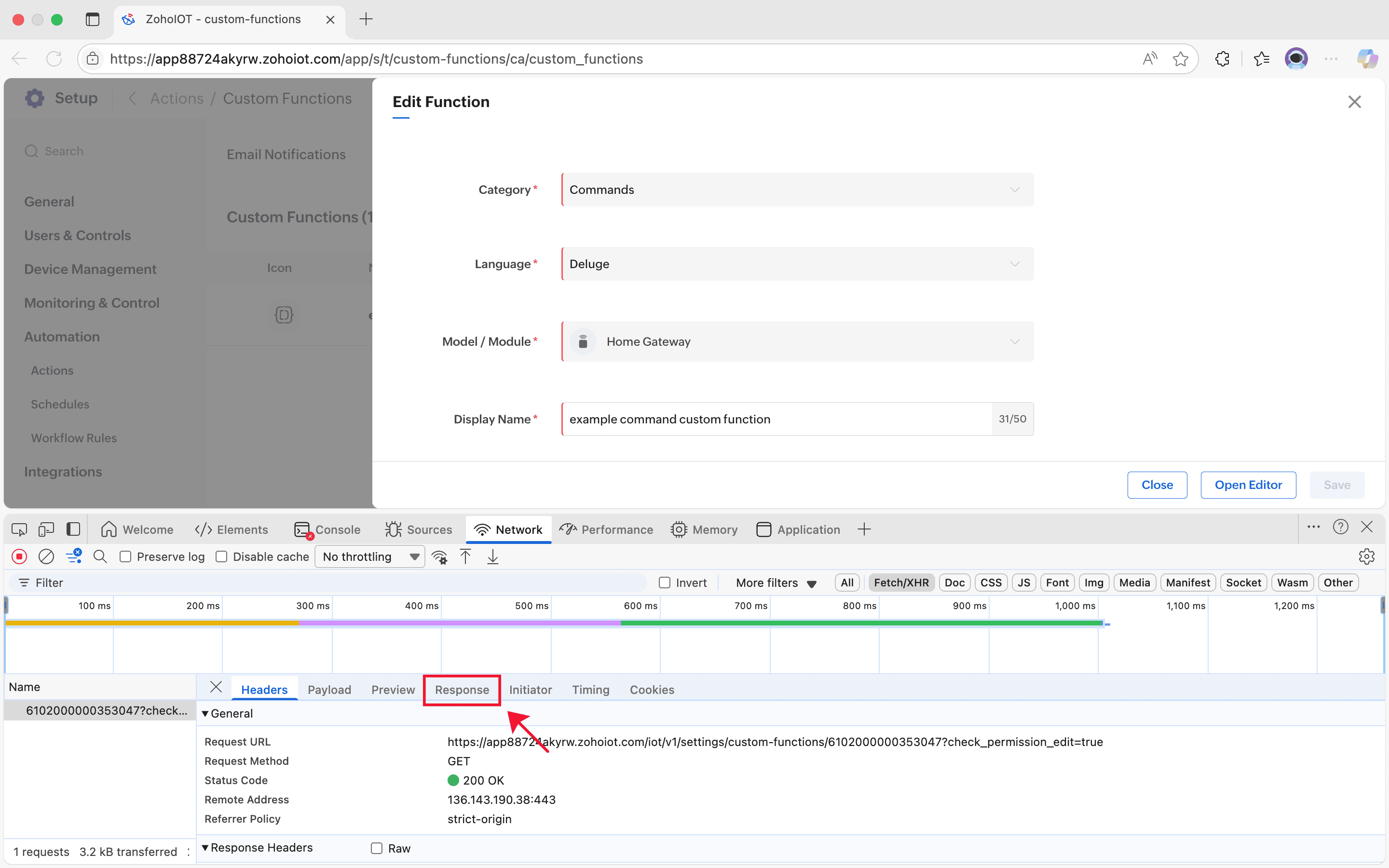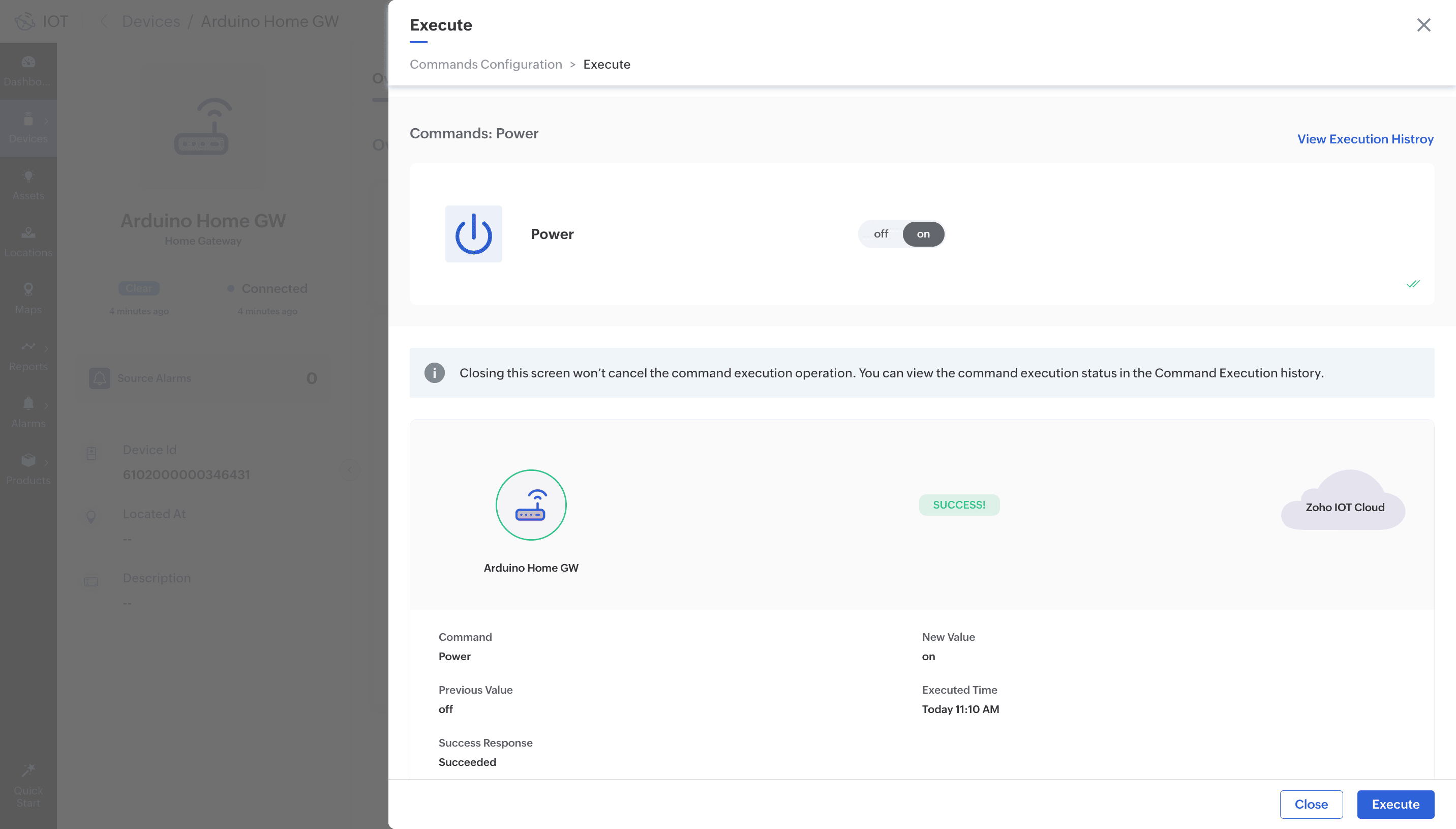Note: The Command Custom Function feature is currently in its beta stage with further enhancements planned in the product roadmap. Contact support@zohoiot.com for more details.