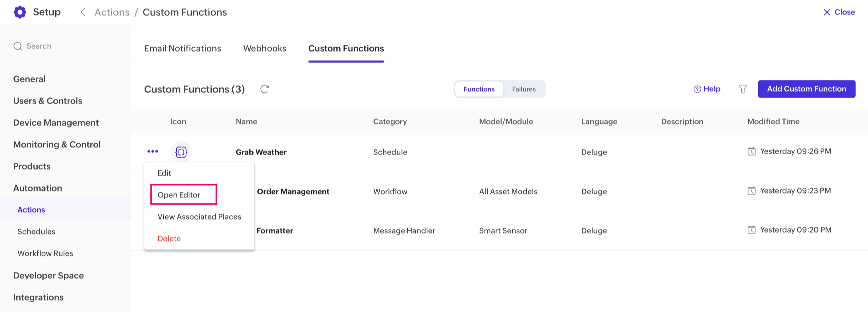 6. Select Open Editor from the context menu. This will open the deluge code builder.