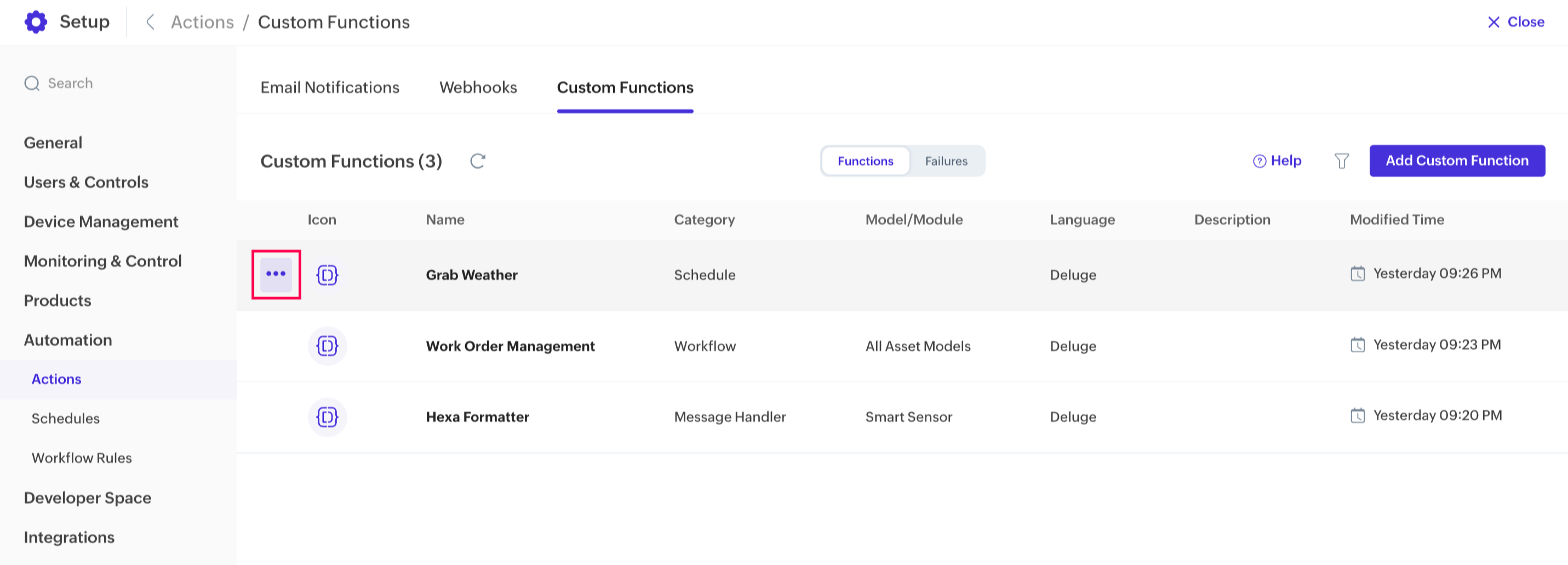 5. Hover over the name of the custom function you want to edit and click the ellipsis (...) icon that appears adjacent to the name. For this illustration, the custom function Grab Weather is selected.