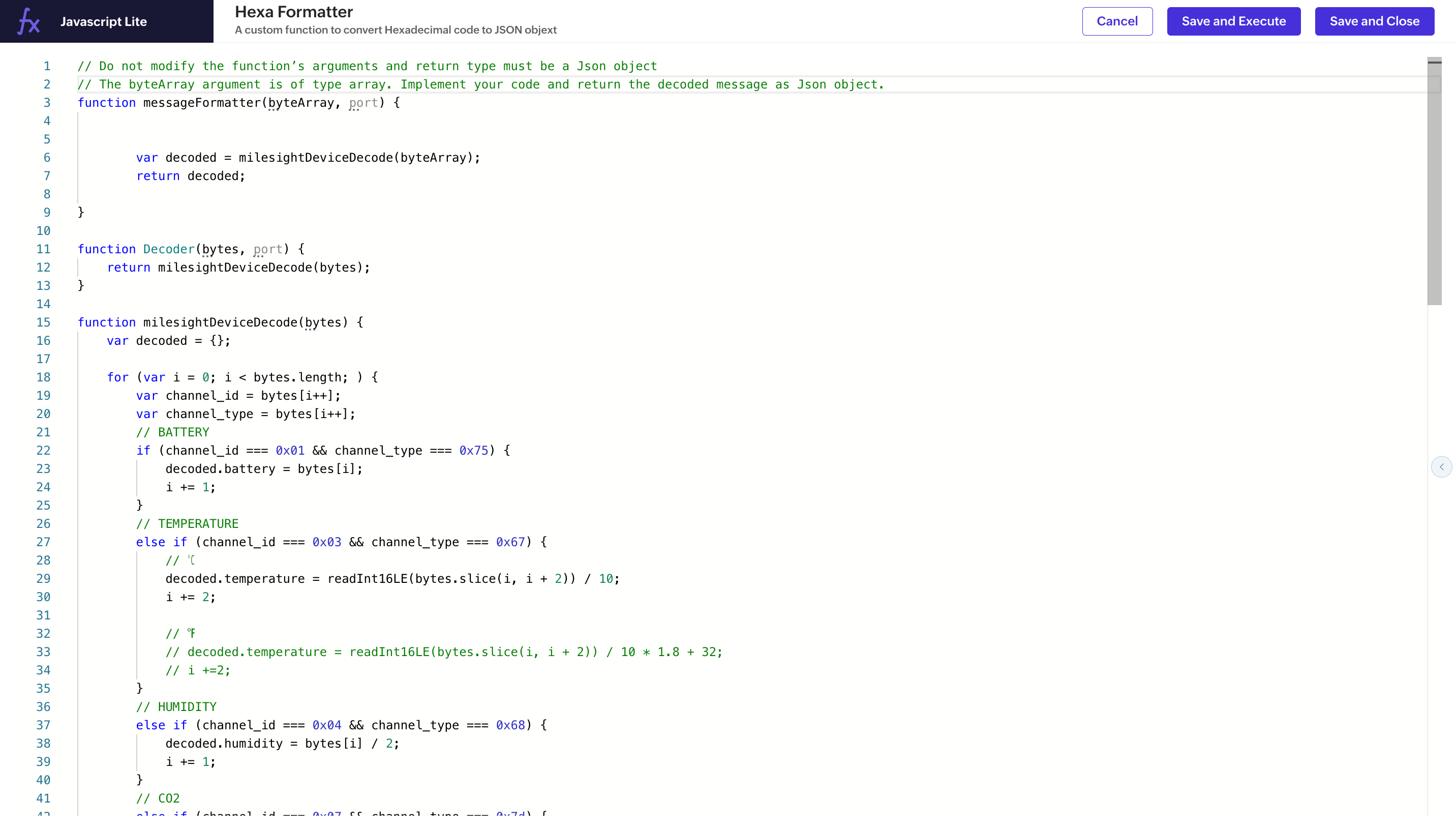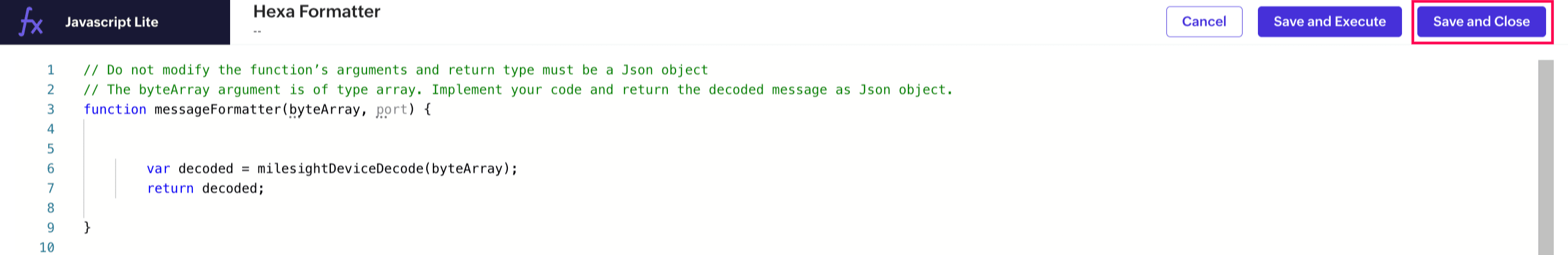8. Click Save and Close to save the updated code to the custom function and exit.