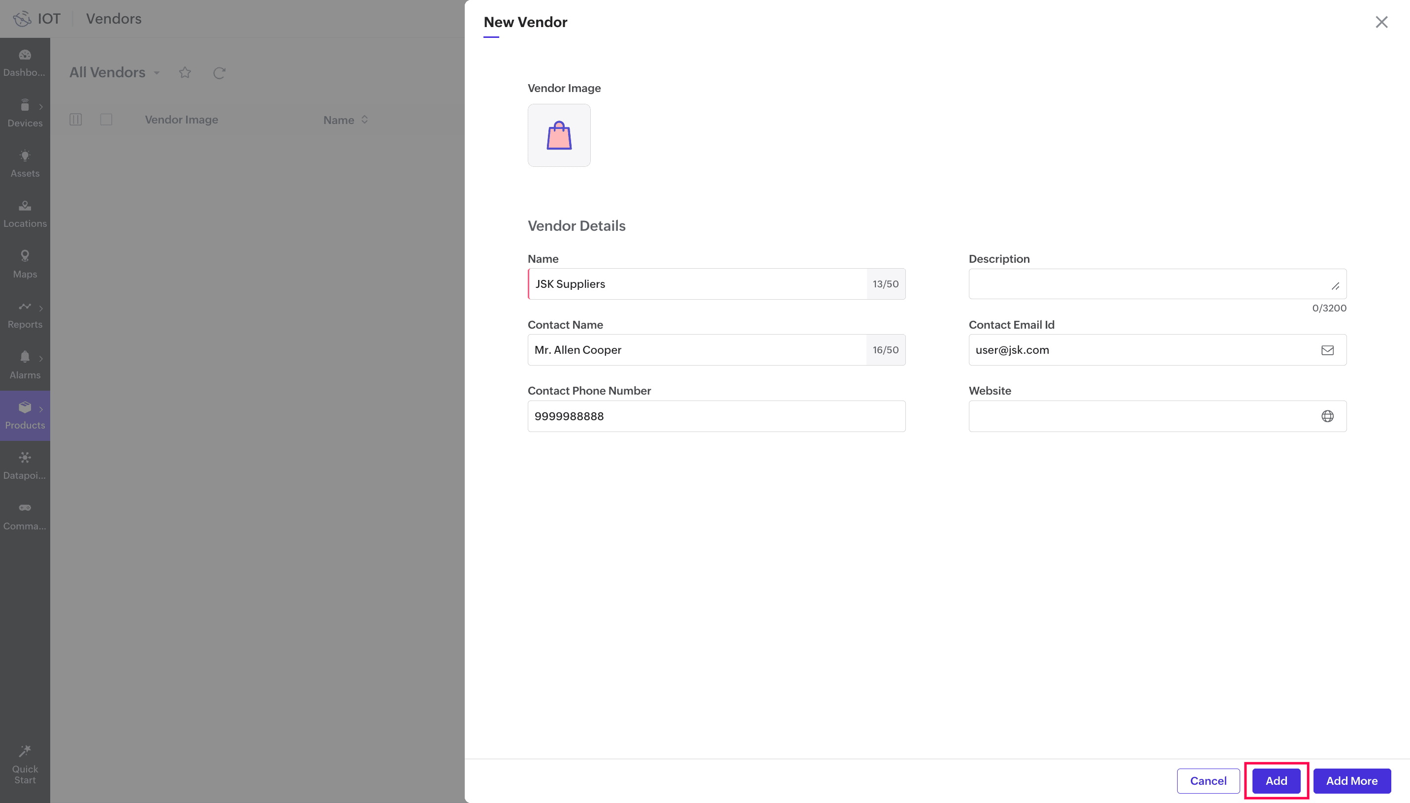 A new record will be added to the application. You can link it to the required device, asset, or location by selecting the record in the vendor lookup field.