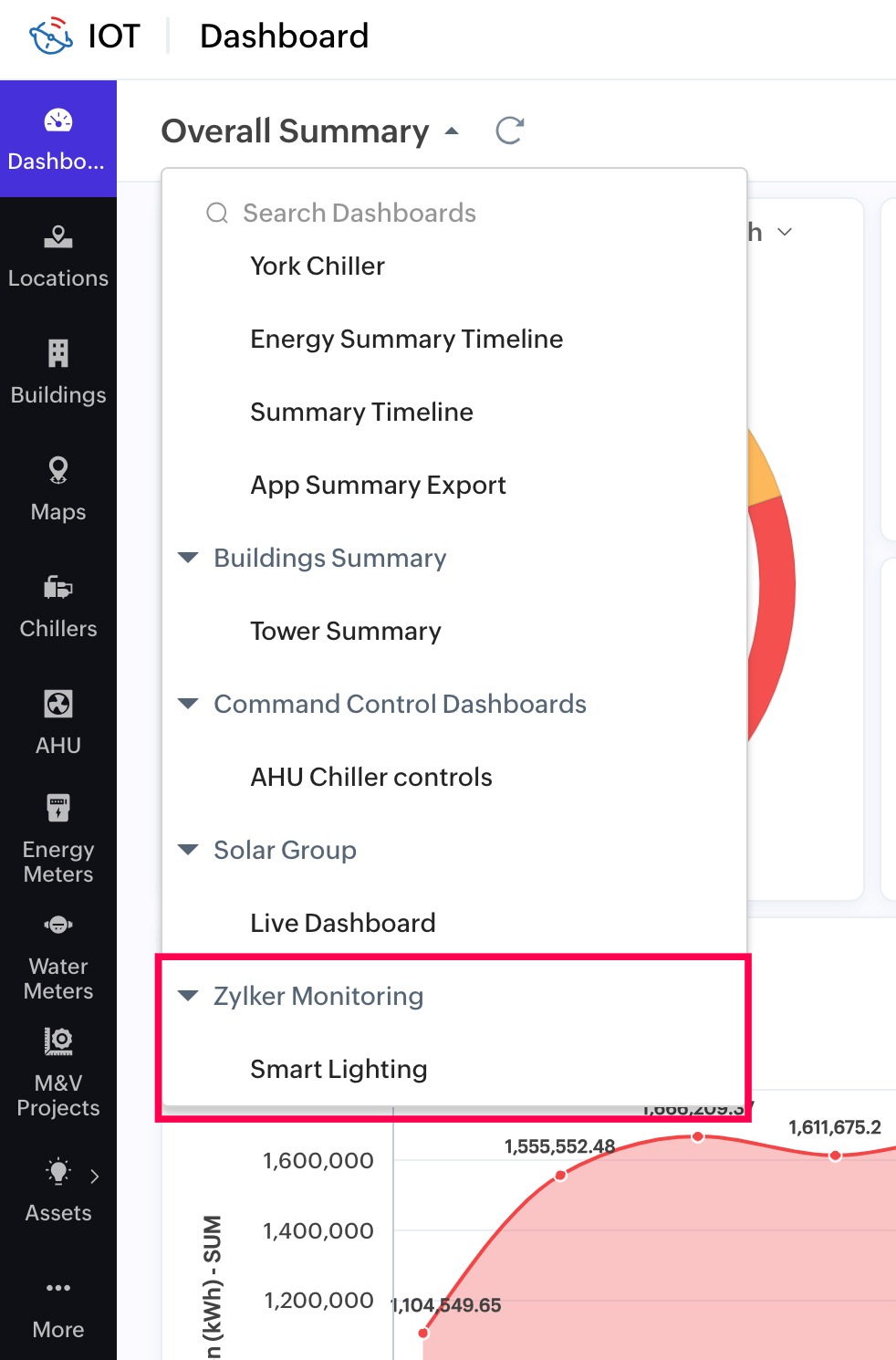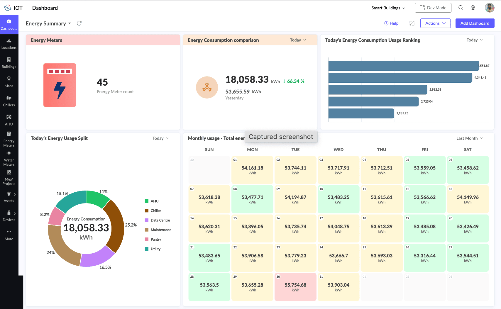 The Energy Monitoring solutions dashboard displays energy consumption details in