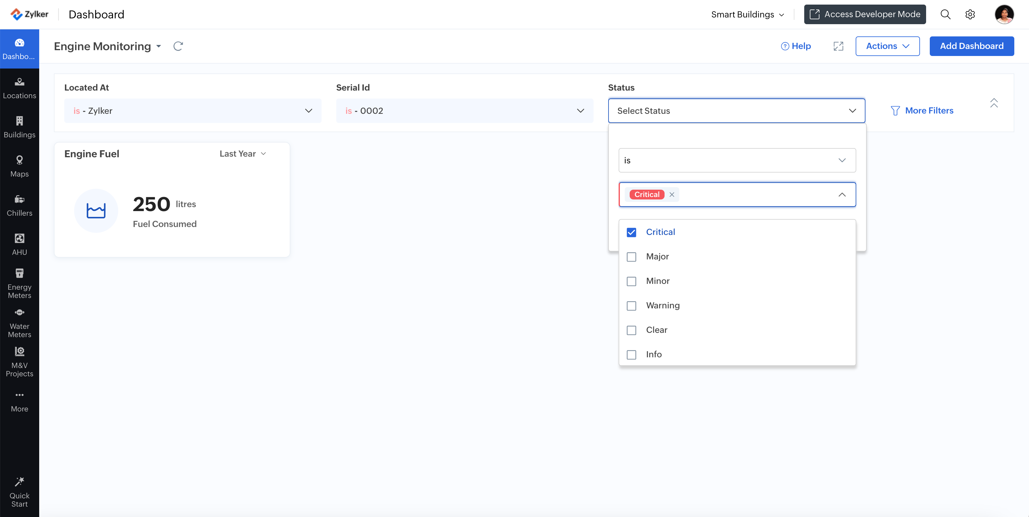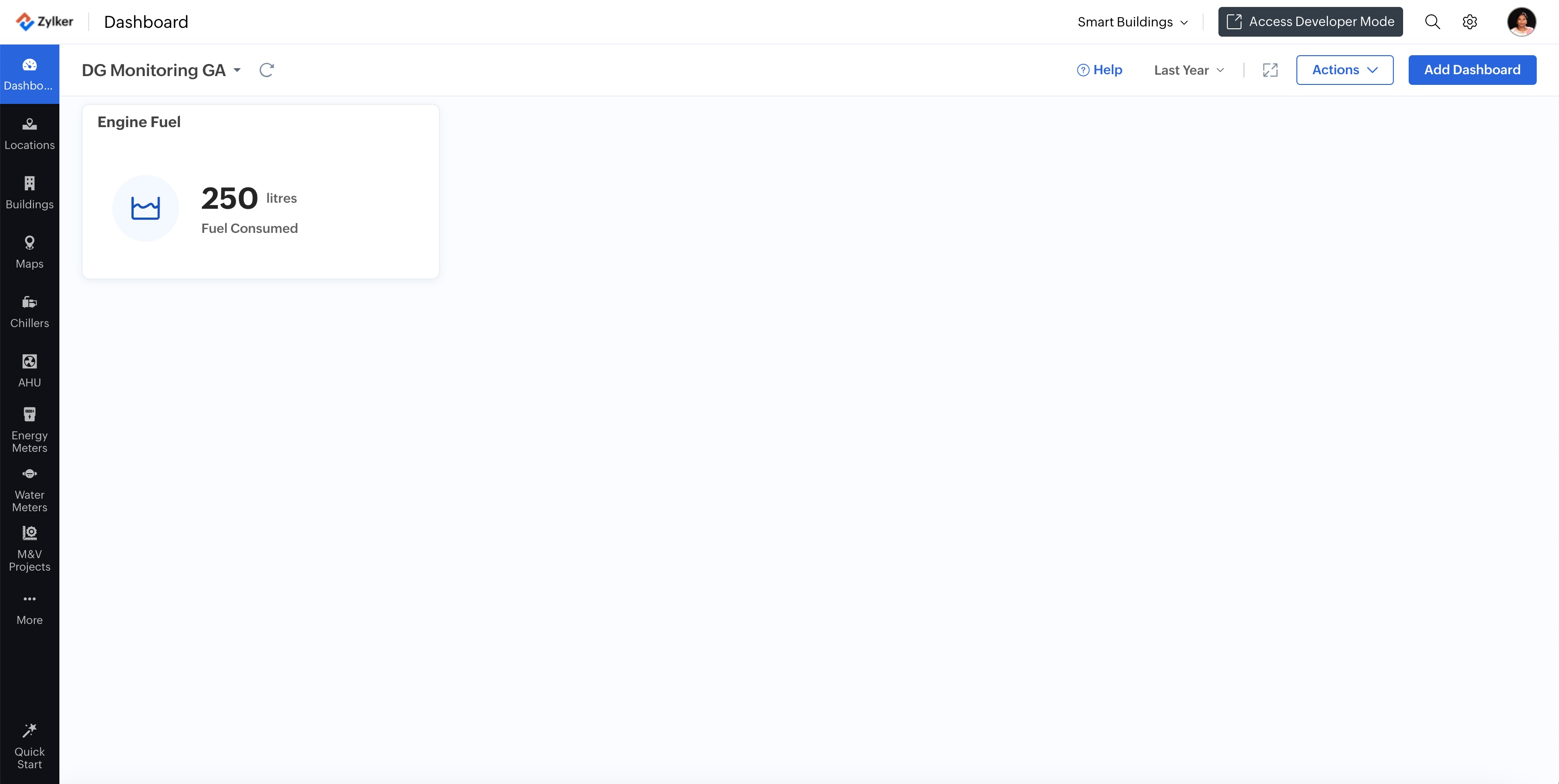 A dashboard is the primary user interface in the Zoho IoT application, displaying vital monitored metrics of devices and assets within the IoT network. A well-designed dashboard serves as a health monitor for the network, showcasing both real-time and historical data.