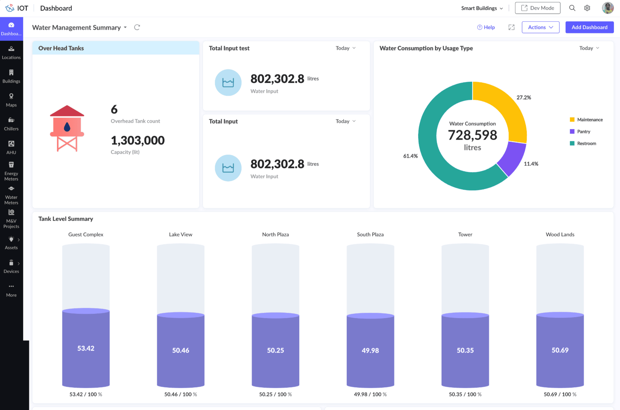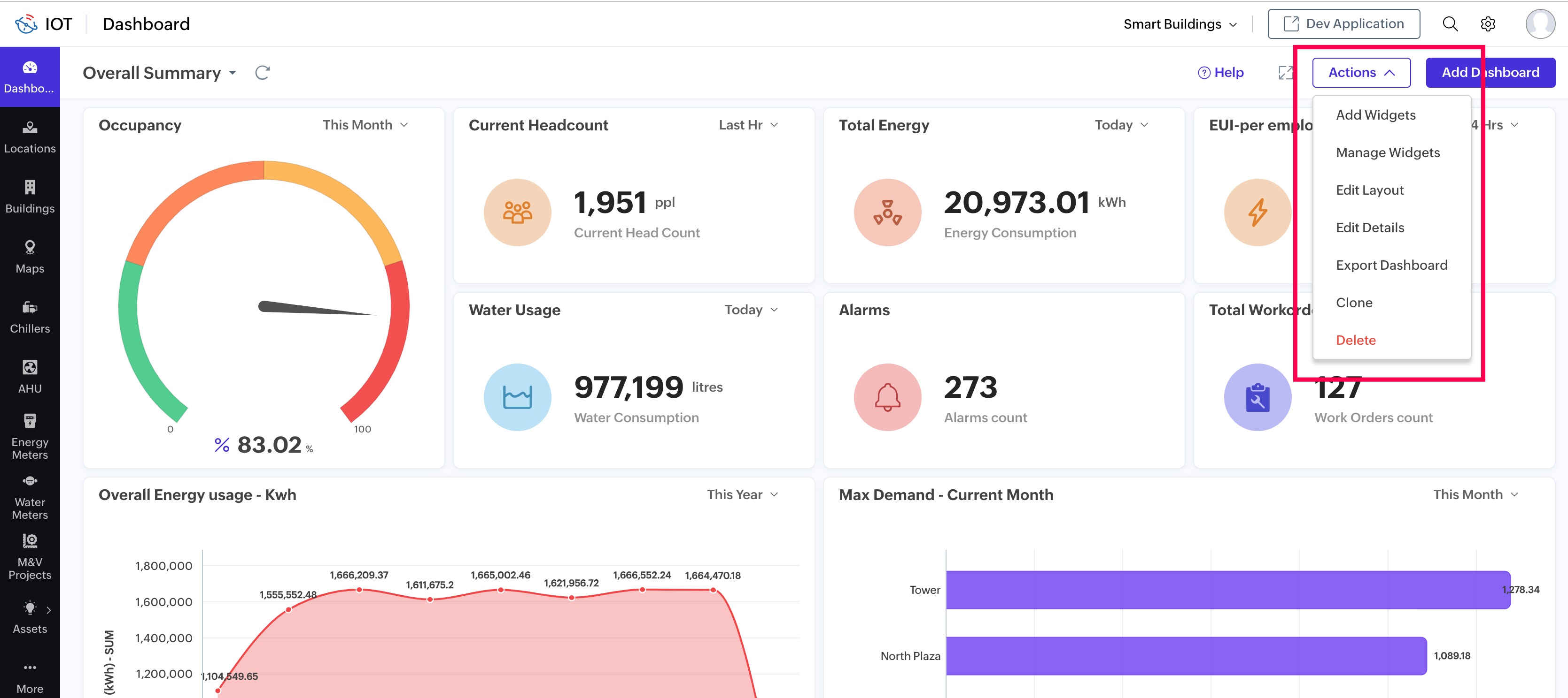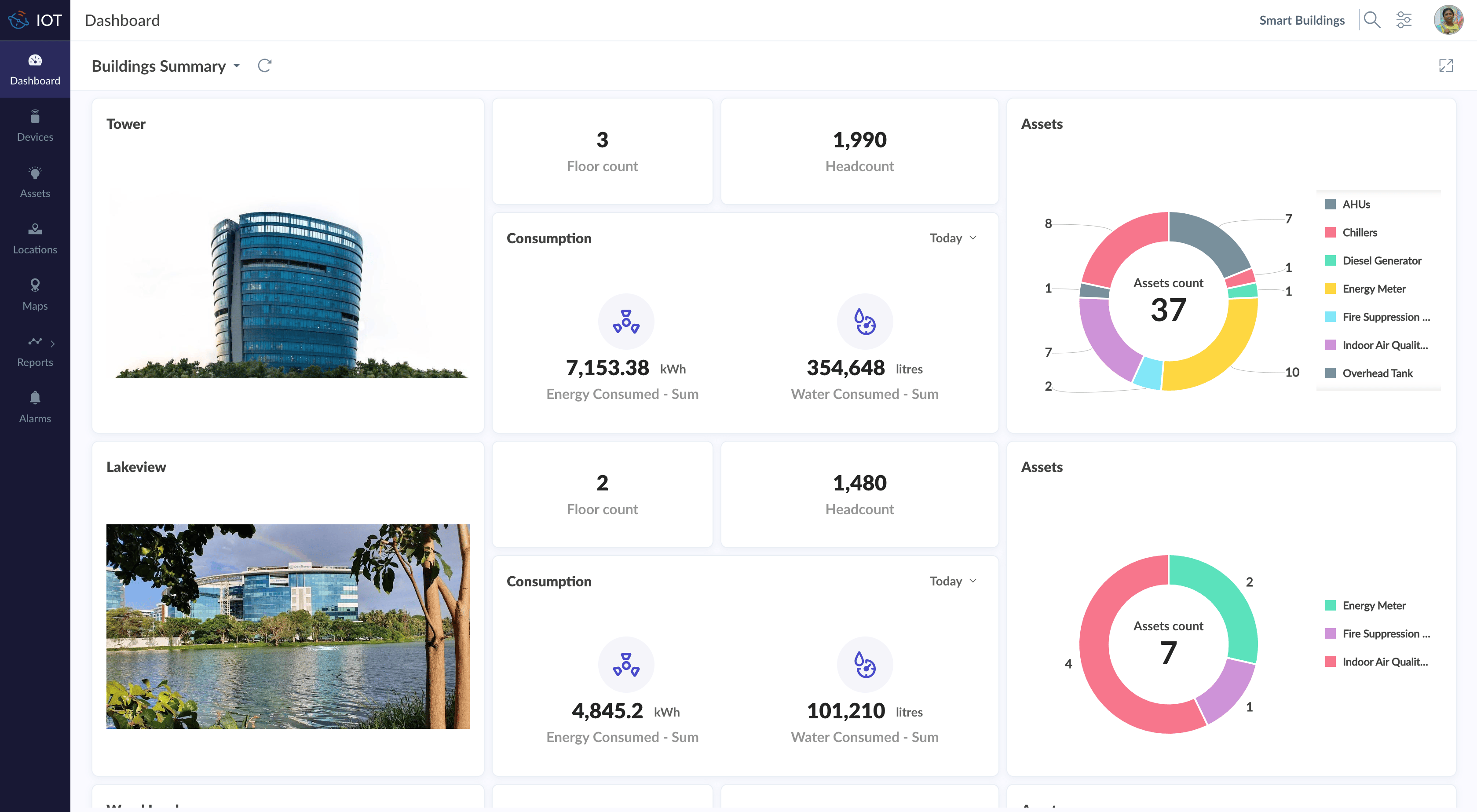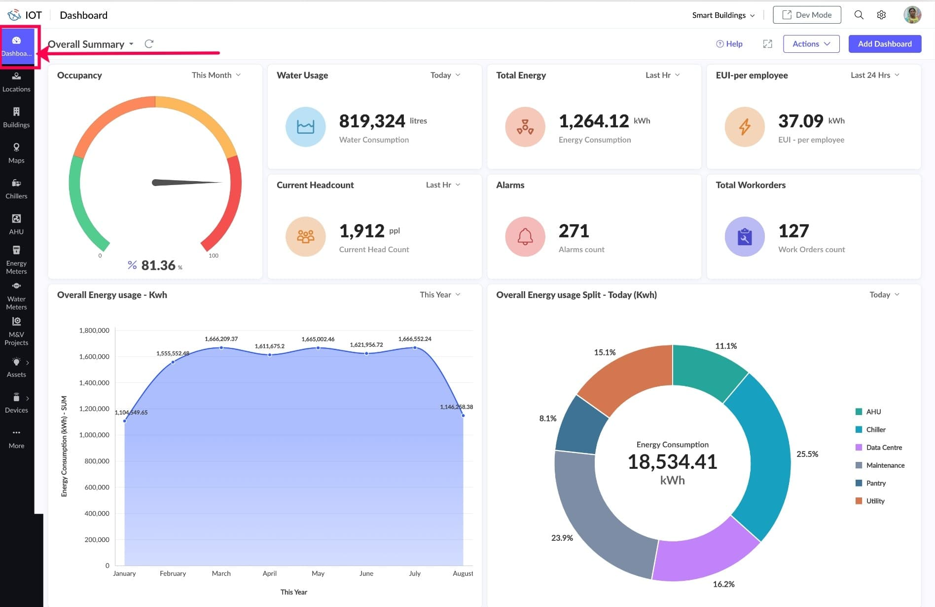 The Smart Building dashboard displays occupancy details, energy usage, water usage, etc.